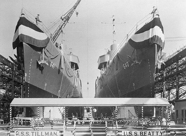 | 153k | Photo #: NH 41785, USS Tillman (DD-641), left center, and USS Beatty (DD-640) right center, on the building ways while being prepared for their dual launching ceremonies, at the Charleston Navy Yard, South Carolina, 20 December 1941. U.S. Naval Historical Center Photograph. | Tony Cowart |