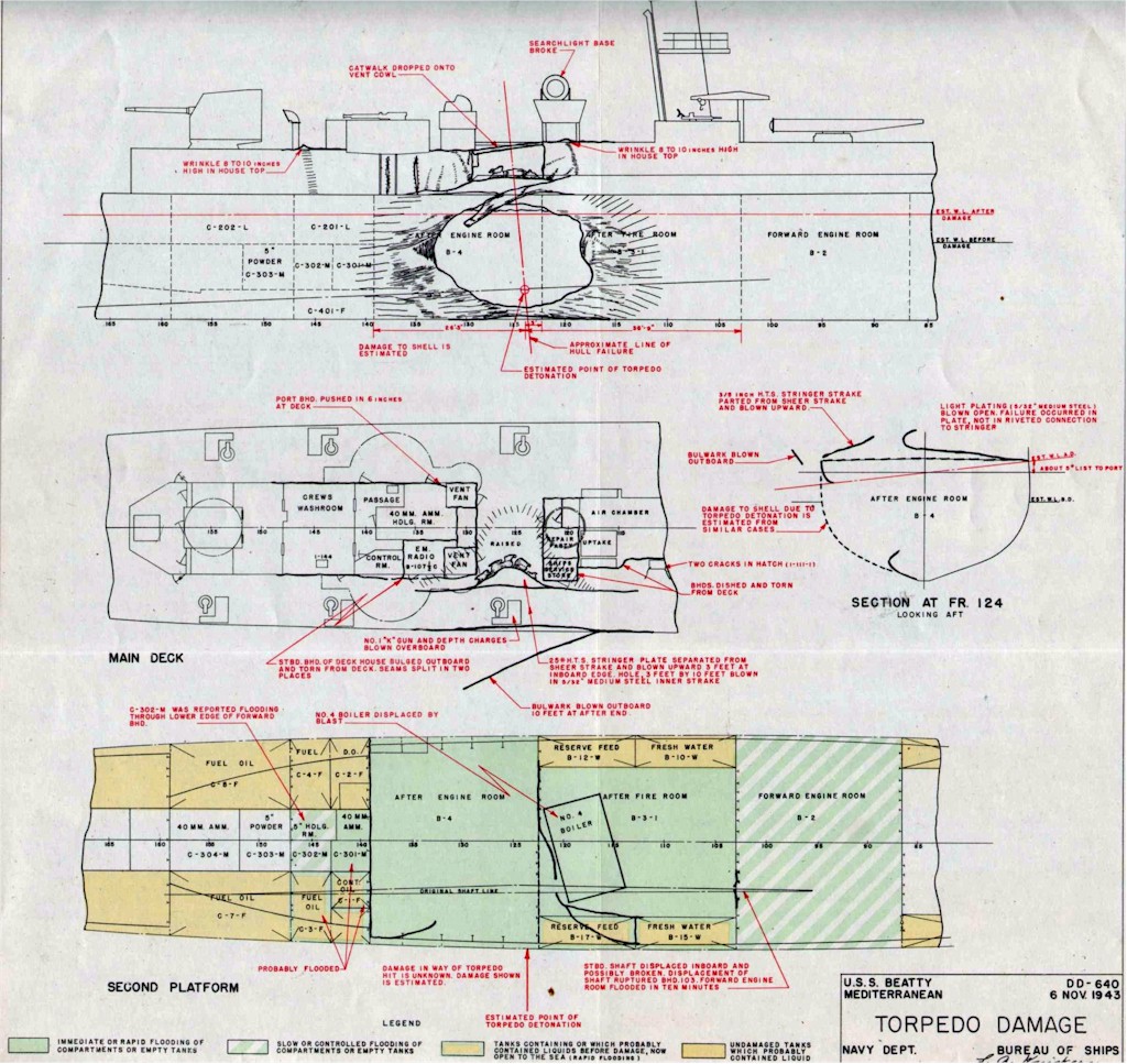 | 291k | United States Naval Department Bureau of Ships War Torpedo Damage/Loss Report No. 50. USS Beatty (DD-640). Aircraft torpedo damage and loss on November 6, 1943 off Cape Bougaroun Algeria. | Mike Green |