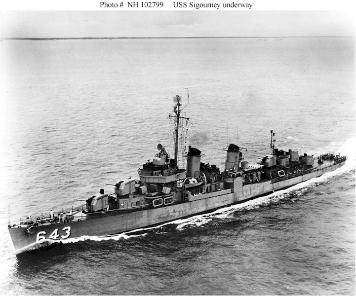 | 125k | Photo #: NH 102799, USS Sigourney (DD-643) underway during the early or middle 1950s. Official U.S. Navy Photograph, from the collections of the Naval Historical Center. | Tony Cowart |