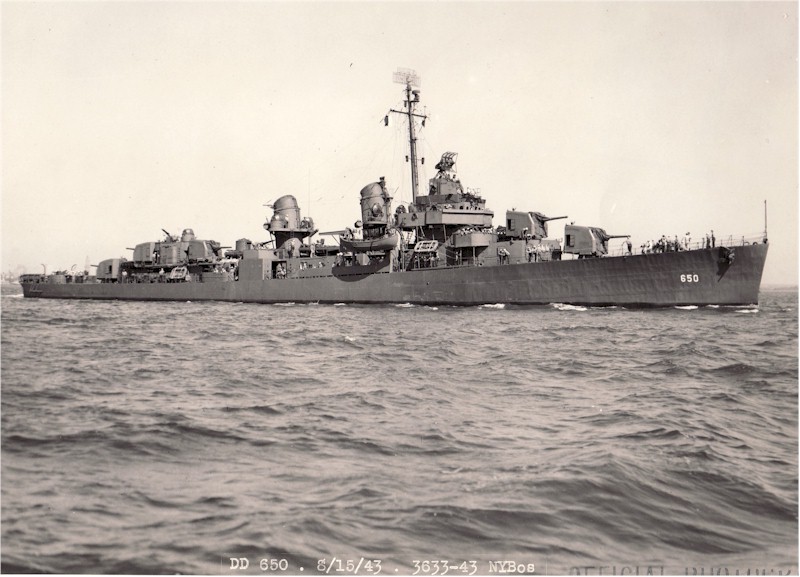 | 105k | USS Caperton (DD-650) on 15 August 1943 at Boston Navy Yard upon completion a couple of weeks after her delivery by Bath Iron Works and commissioning o 30 July. She was completed with three Mk 49 directors controlling the aft three twin 40-mm mounts and two Mk 51 directors in the bridge wings controlling the two forward twin 40-mm mounts. Official USN Photo from the BuShips photo files at NARA (19-N-). | Rick E. Davis | |