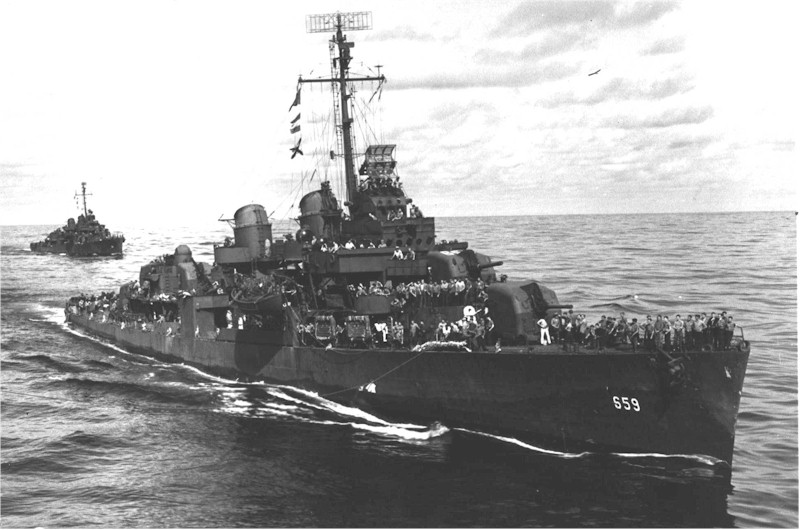 Dashiell during her cruise home in TF 11 from Pearl Harbor to the Atlantic Coast, 09 October 1945. The other DesDiv 50 destroyer visible is Schroeder (DD-501). Photos taken from aboard USS Randolph (CV-15) and distributed to the crew, from the LT Gordon Barrett collection, USS Sigsbee, and the USS Dashiell WW2 cruisebook. | Dave Schroeder and John Chiquoine |