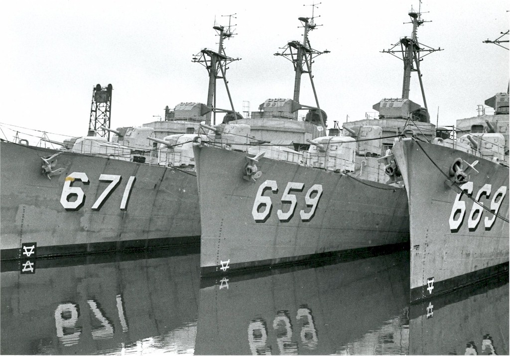 | 197k | USS Gatling (DD-671), USS Dashiell (DD-659) and USS Cotten (DD-669) in reserve at Philadelphia Navy Yard, late 1970. Naval Photographic Center photo 1145643. | Ed Zajkowski |