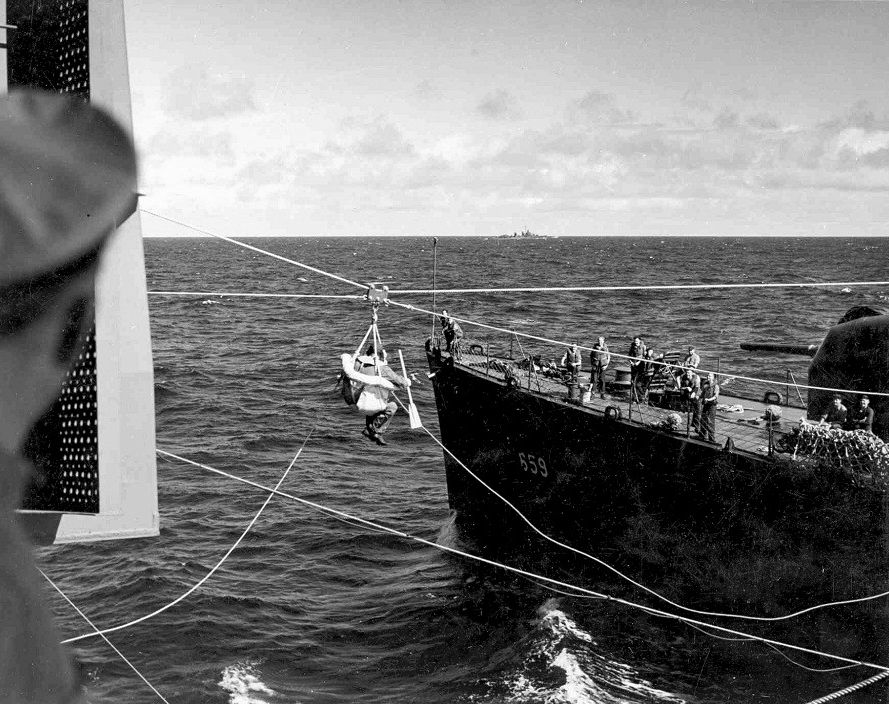 | 229k | The NAAM caption for this photo is undated, and states "after crashing shortly after take-off from the USS Yorktown (CV-10), pilot Lt. Ruefle, with life raft paddle in hand, is returned to the ship after being rescued by the USS Dashiell (DD-659)." Given the position of the crewman and equipment on Dashiell's forecastle, I feel this is incorrect and it instead one of the crewmen of the crashed TBF (pilot LT James W. Condit A-V(N) USNR, crew J.H. Marshall, RM2c, and K.O. Kolberg, MM2c) being returned to Yorktown on the morning of 10 July 1943. Compare with the above photo.