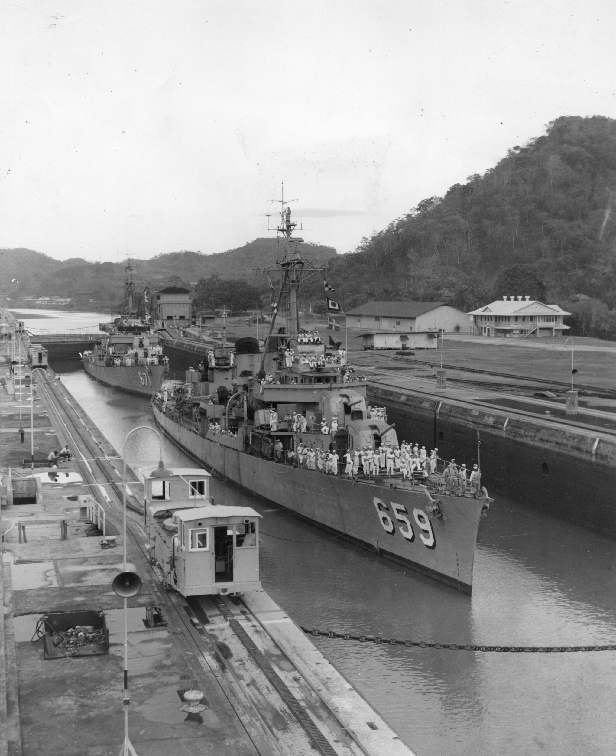 | 593k | USS Dashiell (DD-659) and USS Gatling (DD-671) pass through the Panama Canal, circa 1957. U.S. Navy All Hands magazine, April 1957. NHHC Naval Subjects Collection, catalog #L42-72.04.01 | Robert Hurst |
