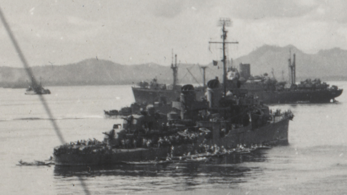 | 223k | Filipinos converging on USS Dashiell (DD-659) in San Pedro Bay on 11 or 18 December 1944. Photo taken from aboard Russell (DD-414), collection of Ens E. Klump. | John Chiquoine |