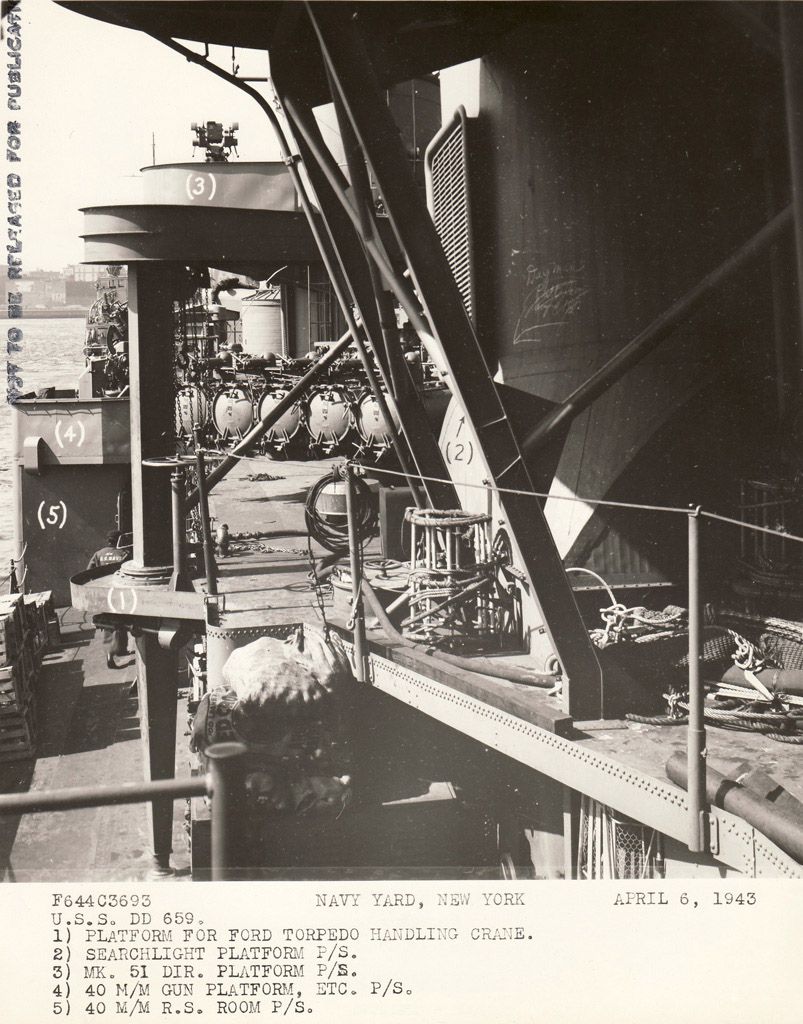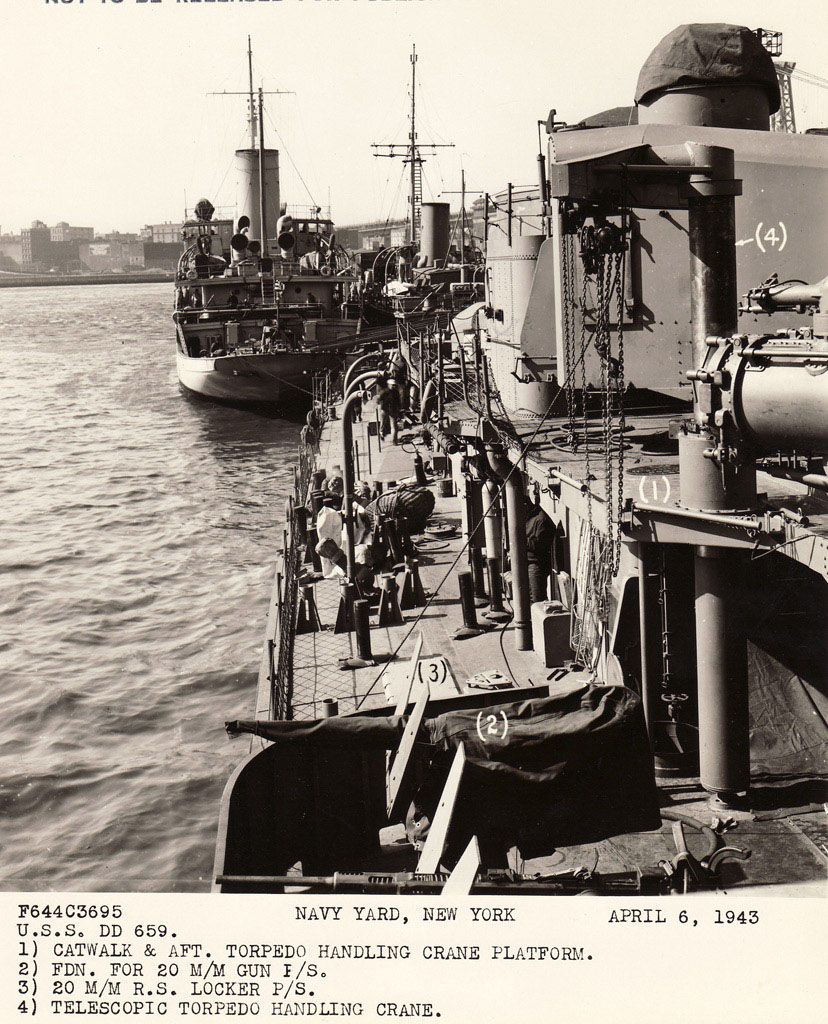 Four views of Dashiell after her initial fitting out at Brooklyn Navy yard, 08 April 1943. Photos from National Archives 19-LCM files. | John Chiquoine |