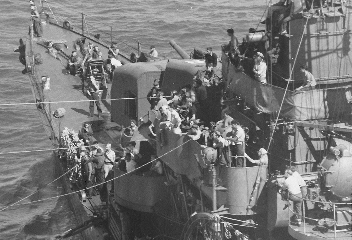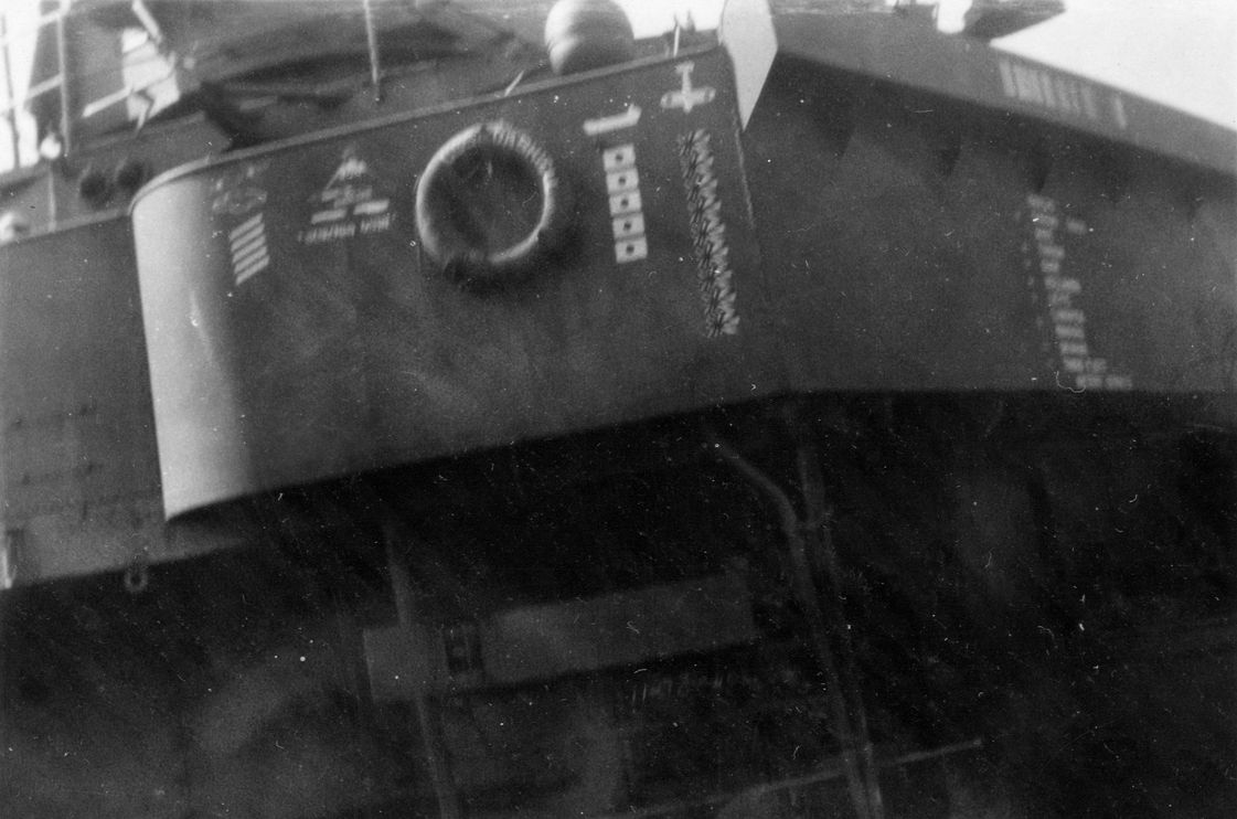 | 176k | A tired Dashiell in the Cooper River 01 or 02 November 1945, enroute to Charleston Navy Yard after visiting Wilmington, NC with Coates (DE-685) for Navy Day celebrations there, 25-31 October 1945. Dashiell had just returned to Charleston on 21 October from a 21-month continuous forward deployment. This was their first view of Conus in that interval, and first purposeful availability. Photo circulated to crew. | John Chiquoine |
