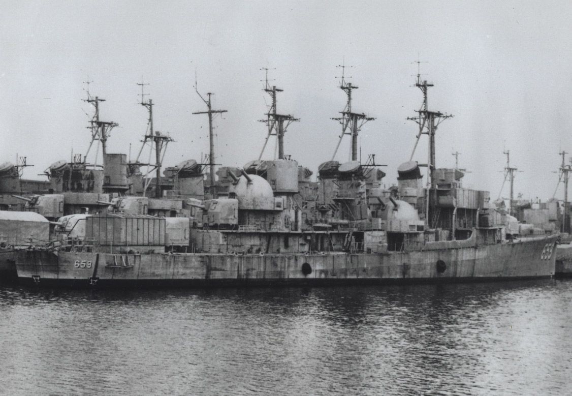 | 150k | Dashiell moored as part of the Atlantic Reserve Force in the back basin of Philadelphia Navy Yard, circa 1970. | John Chiquoine |