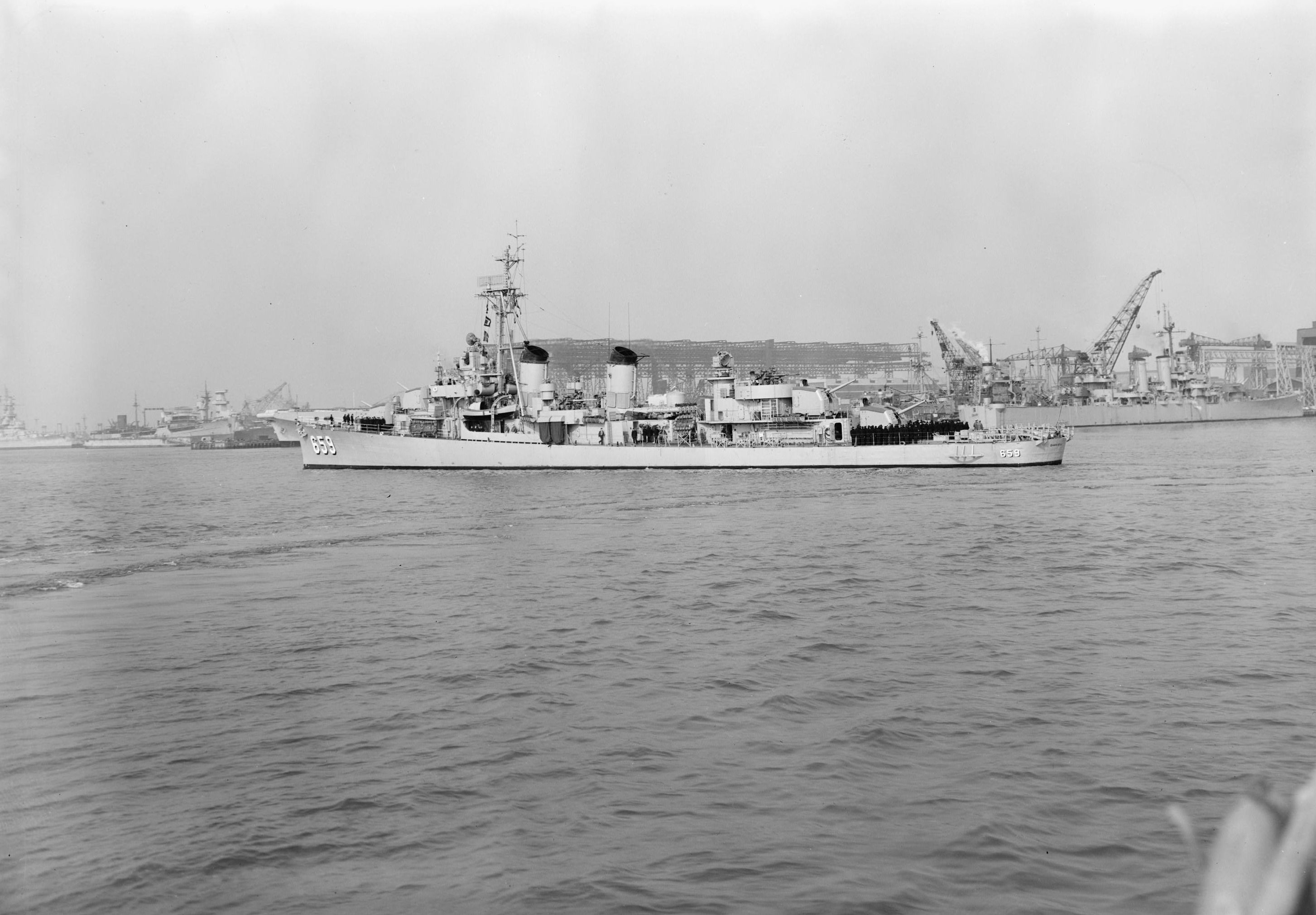 | 100k | Overhead view of Dashiell moored at the Atlantic Reserve Force piers at Charleston Navy Yard, 04 September 1947. Schroeder (DD-501) is moored to her port side. National Archives photo 80-G-278613. | John Chiquoine and Rick Davis |
