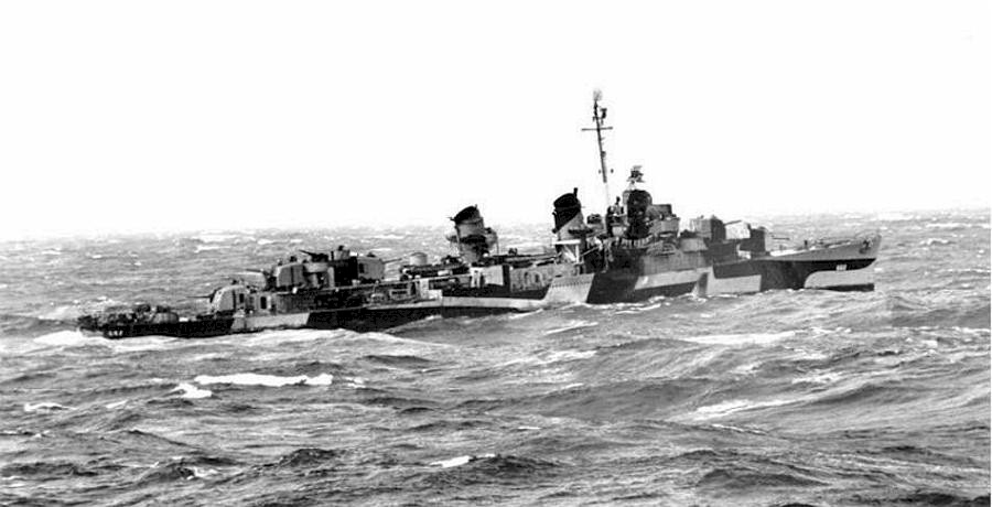 | 136k | USS Bennion (DD-662), Underway on 13 January 1945. The ship is painted in Camouflage Measure 32, Design 13D. This photograph was retouched by wartime censors to eliminate the radar antenna atop Bennion's Mark 37 gun director. Official U.S. Navy Photograph, from the collections of the Naval History and Heritage Command. Photo #: NH 107197. | Rob Rielly/Robert Hurst |