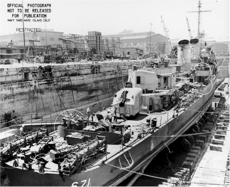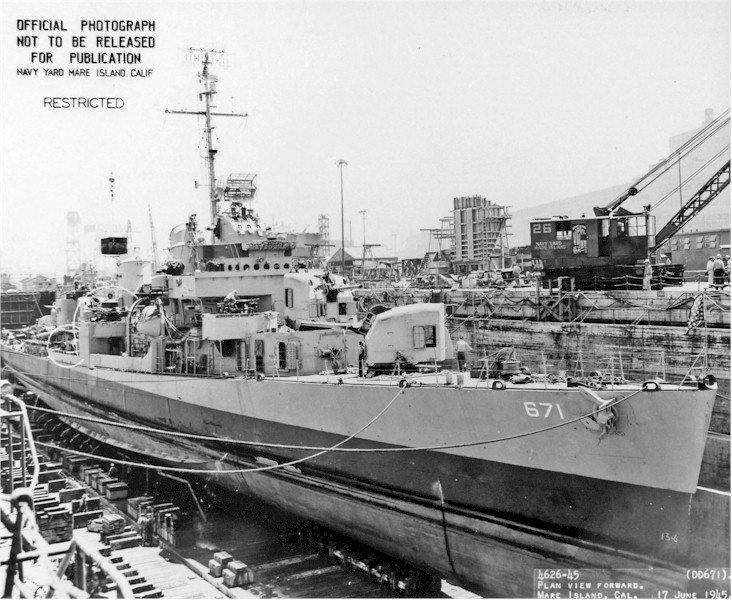 | 131k | Forward plan view of USS Gatling (DD 671) in dry dock #3 at Mare Island on 17 June 1945. | Darryl Baker |
