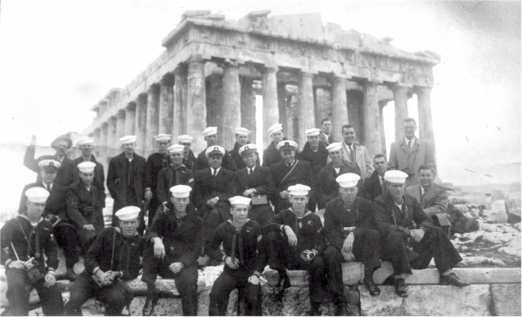 | 134k | USS Hickox (DD-673) Liberty Party visiting the Acropolis, probably in 1954. From the collection of Anthony J. Danca, he is the CPO sitting just about dead-center in the middle of the second row with his hands folded. | Richard Danca |