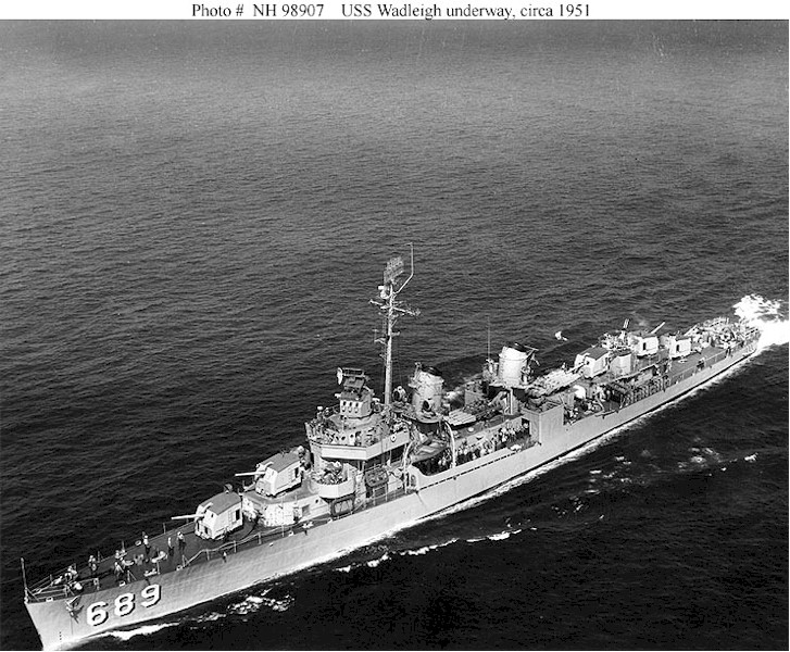 | 181k | USS Wadleigh (DD-689) Underway, circa 1951, soon after she was recommissioned. Official U.S. Navy Photograph, from the collections of the Naval Historical Center. | Fred Weiss |