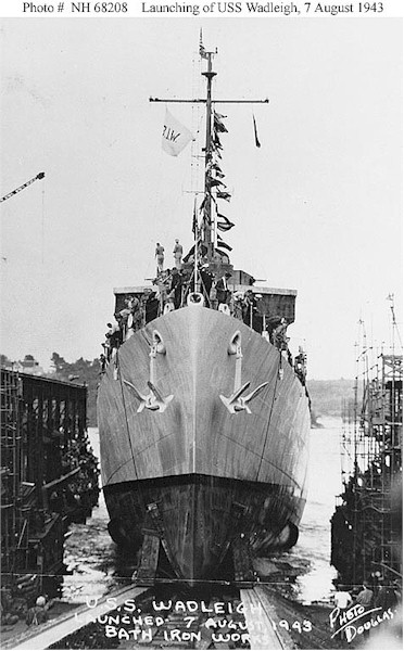 | 72k | USS Wadleigh (DD-689) Launching, at the Bath Iron Works shipyard, Bath, Maine, 7 August 1943. Photographed by Douglas. Courtesy of Quentin Ludgin, 1969. U.S. Naval Historical Center Photograph. | Fred Weiss |