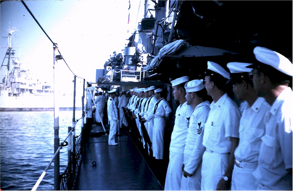 | 100k | Chilean sailors manning the rails on board the destroyer Blanco Encalada DD 14 (ex-USS Wadleigh, DD-689), circa 1963, location unknown. Photo Chilean Navy, Official. | Robert Hurst |