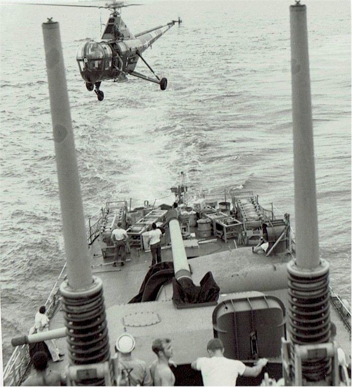 | 92k | USS Barry (DD-933) (center) and USS Wadleigh (DD-689) (left distance) Pass astern of USS Des Moines (CA-134), Sixth Fleet flagship, while the latter was at anchor off Rhodes, Greece, in mid-June 1958. Note fire control radar on one of Des Moines' 3"/50 gun mounts, at right, and the U.S. Ensign flying at top left. Official U.S. Navy Photograph, from the collections of the Naval Historical Center. | Fred Weiss |
