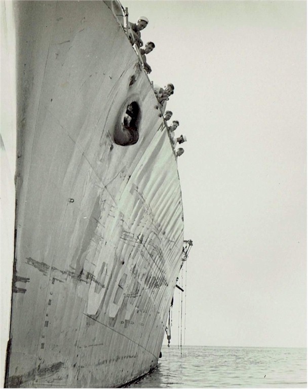 | 83k | USS Wadleigh (DD 689) in dry dock USS ARD-16 in November 1944. Photo shows starboard side looking forward at hole in shell, starboard side . Note divers patch above bilge keel. Plating is bent sharply inboard at end of reduction gear foundation. Source: Structural Repairs in Forward Areas During World War II, Bureau of Ships Navy Department, December, 1949, Photo No. 35. | Mike Green |