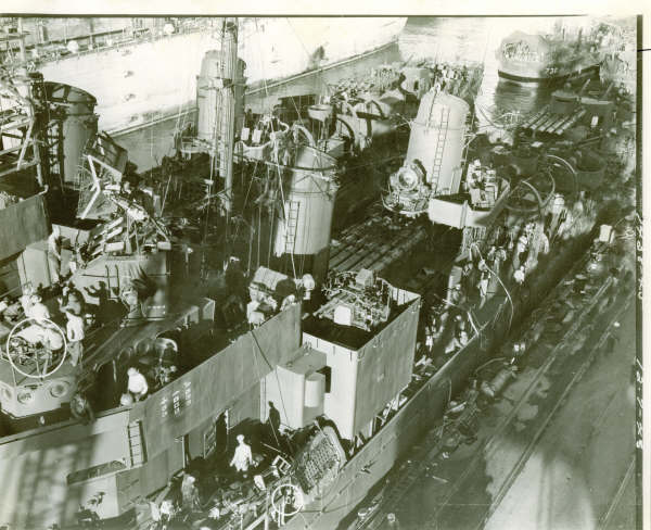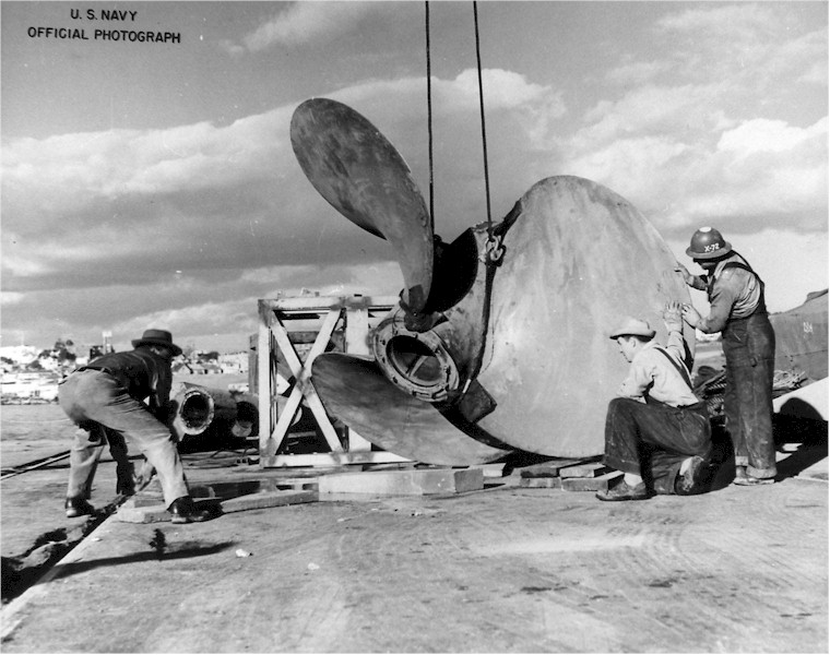 | 117k | One of USS De Haven (DD-727) propellers being removed during her overhaul at Mare Island on 8 November 1945. | Darryl Baker | |