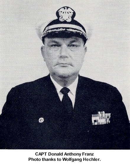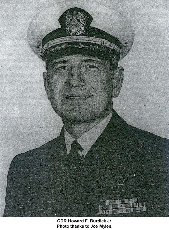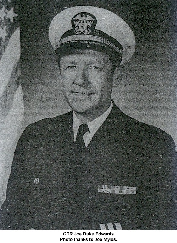 CDR John Bagley Dimmick Mar 31 1944 - Jun 17 1945 CDR William Heald Groverman Jr. Jun 17 1945 - Dec 6 1946 (Later RADM) CDR William Metcalfe Kaufman Dec 6 1946 - Aug 19 1948 CDR Millard John Smith Aug 19 1948 - Oct 15 1950 CDR Oscar Berndherd Lundgren Oct 15 1950 - Apr 1 1951 CDR Farrell Burton McFarland Apr 1 1951 - Jun 17 1952 CDR Theodore Charles Siegmund Jun 17 1952 - Oct 10 1953 CDR Thomas Ward Hunt Oct 10 1953 - Aug 1 1955 CDR Floyd Murphy Symons Aug 1 1955 - Oct 3 1957 CDR John Joseph Phillips Oct 3 1957 - Jul 9 1959 CDR William Calhoun Singletary - Jul 9 1959 - Oct 21 1961 CDR James Ward Montgomery Oct 21 1961 - Jul 24 1963 (Later ADM) CDR John Augustine Delaney Jul 24 1963 - Aug 13 1964 CDR Robert Perry Chrisler Aug 13 1964 - May 2 1966 CAPT Donald Anthony Franz May 2 1966 - Aug 6 1968 CDR Edward Joseph Casey Jr. Aug 6 1968 - Jan 15 1970 CDR Henry Clay Morris Jr. Jan 15 1970 - Jul 23 1971 CDR Howard Frederick Burdick Jr. Jul 23 1971 - Feb 23 1973 CDR Joe Duke Edwards Feb 23 1973 - Sep 21 1973 LCDR Ronald Lynn Bunce Sep 21 1973 - Dec 3 1973