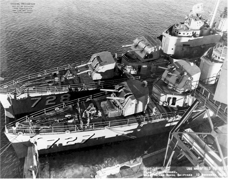 | 183k | Forward plan view of USS Mansfield (DD-728) outboard of USS De Haven (DD-727) at Mare Island on 12 November 1947. Navy Photo 2207-47 | Darryl Baker | |