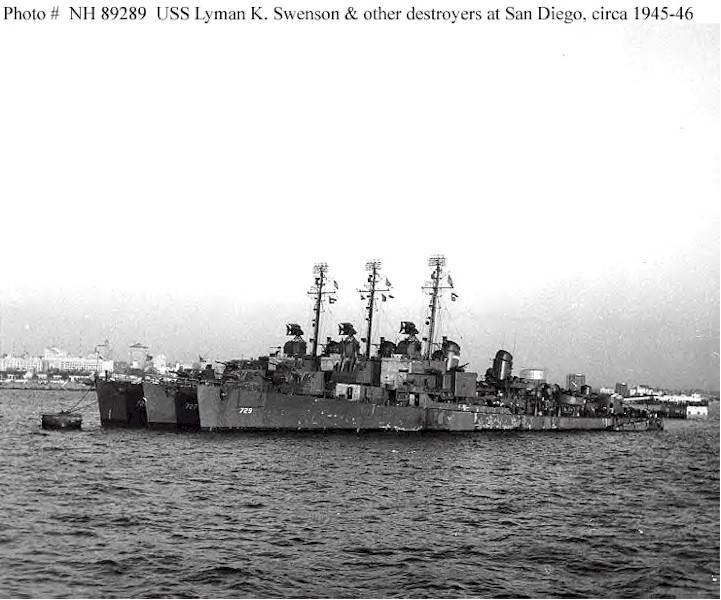 | 105k | USS Lyman K. Swenson (DD-729) Moored at San Diego, California, with two other destroyers, circa 1945-46. Middle ship is USS De Haven (DD-727). Courtesy of John Hummel, 1979. U.S. Naval Historical Center Photograph. | Fred Weiss | |