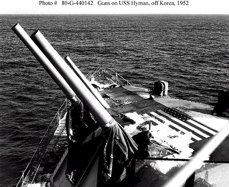 | 203k | Ship's forward 5"/38 guns aimed at targets on the Korean coast, during bombardment operations in February 1952. Note U.S. flag painted atop mount 52. Official U.S. Navy Photograph, now in the collections of the National Archives. | Fred Weiss | |