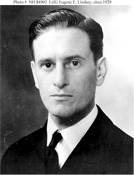 | 74k | Eugene E. Lindsey, born in Sprague, Wash., 2 July 1905, graduated from the Naval Academy in 1927. After duty in Nevada (BB-36) and Saratoga (CV-3) he completed flight training in 1929, and served with a bombing squadron in Lexington (CV-2)and an observation squadron in Maryland (BB-46). From 3 June 1940 he commanded a torpedo squadron in Enterprise (CV-6). Lindsey was awarded the Distinguished Flying Cross for brilliantly successful leadership of his squadron in attacks on Kwajalein and Wotje in the Marshalls 1 February 1942. He gave his life in action 4 June 1942 in the Battle of Midway; in which his squadron played a valiant and selfless role, pressing home their attack through merciless antiaircraft fire. He was posthumously awarded the Navy Cross for his important contribution to this great American victory. Photo #: NH 84903. Lieutenant (Junior Grade) Eugene E. Lindsey, USN (1905-1942), photographed circa 1929. He completed flight training in that year. U.S. Naval Historical Center Photograph. | Bill Gonyo | |