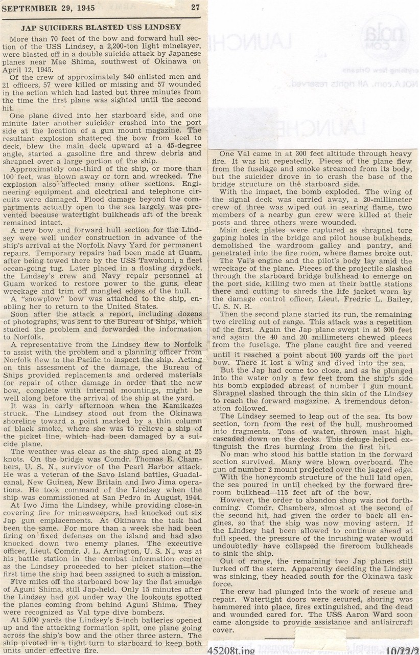 | 494k | Newspaper clipping from September 29 1945 describing the attacks on the Linsey at Okinawa on April 12 1945. | Ron Reeves | |