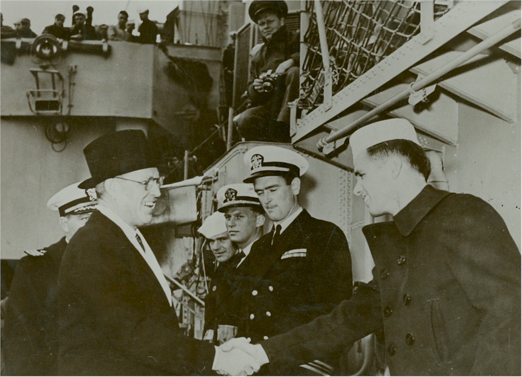 | 174k | Joseph P. Kennedy, Sr. shaking the hand of his son Robert Kennedy aboard USS Joseph P. Kennedy, Jr. in 1946. Robert was a radarman stationed aboard the ship at that time. Thanks to Rich Angelini. | Ed Zajkowski | |