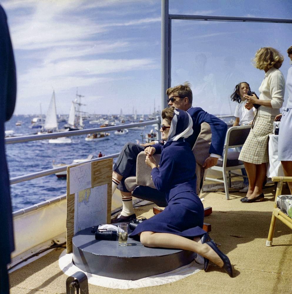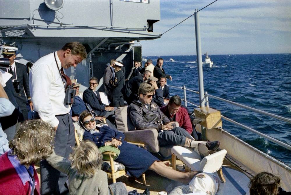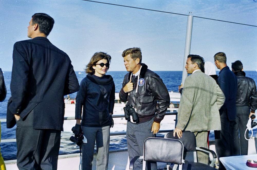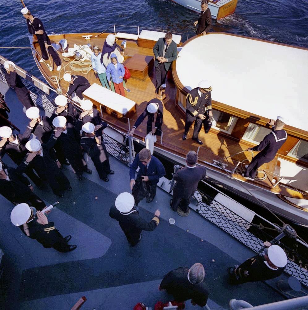 175k | Mrs. Kennedy, President Kennedy and others off Newport, RI, watching the America's Cup, aboard the USS Joseph P. Kennedy Jr. (DD-850), 15 September 1962. Photo taken by Robert L. Knudsen, White House. John F. Kennedy Presidential Library and Museum, accession number KN-C23943 | Robert Hurst | |