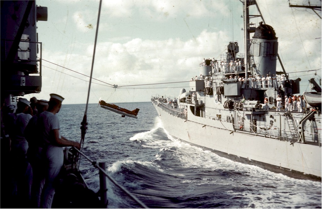 | 176k | USS Du Pont (DD-941) highlining recovered drone back to USS Boston (CAG-1) after gunnery shoot in the Atlantic, June 1961. | Roy Williams |