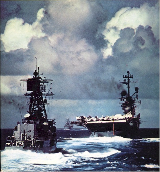 | 106k | Photo NS023119, USS Bon Homme Richard (CVA-31) and USS Parsons (DDG-33), foreground, sail in company with an amphibious squadron, background, as they make their way from the Gulf of Tonkin to Yokosuka, Japan, following the end of their tour of duty off Vietnam. Believed to have been taken in late July 1970. | Robert Hurst |