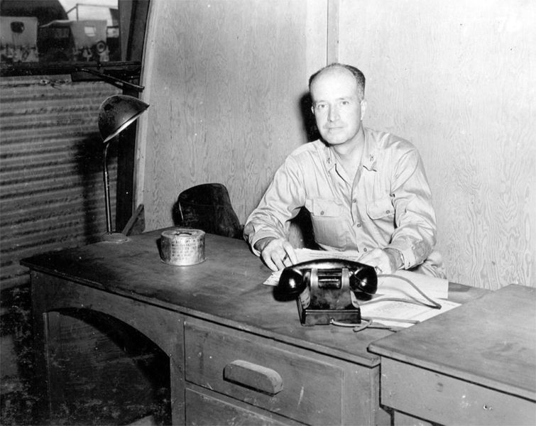 | 75k | Rear Admiral William Sterling "Deak" Parsons (November 26, 1901 - December 5, 1953) was born at Chicago, Illinois on 26 November 1901, was appointed to the United States Naval Academy in 1918 and commissioned Ensign upon graduating in June 1922. His first assignment was in the battleship Idaho (BB-42), which was followed by post-graduate study in ordnance engineering at the Navy Postgraduate School, Washington, D.C. He then served on board Texas (BB-35) before returning to Washington as Liaison Officer between the Bureau of Ordnance and the Naval Research Laboratory (NRL), where he aided in the early development of radar. In 1939 he was assigned as Experimental Officer at the Navy Proving Grounds, Dahlgren, Virginia, and helped to develop the radio proximity fuze for anti-aircraft shells for the fleet. On 15 June 1943 he reported to the Los Alamos Laboratory of the Manhattan Project at Los Alamos, New Mexico, as Ordnance Division Associate Director and Officer in Charge of Project Alberta. After witnessing the first atom bomb test in New Mexico, Captain Parsons was appointed Officer-in-charge of the Overseas (Tinian, Marianas) Technical Group, and as Bomb Commander he assembled — in flight — the triggering device of Little Boy, the first atomic bomb used in combat over Hiroshima on 6 August 1945. He was next assigned as Assistant Chief of Naval Operations for Special Weapons and as Deputy Commander for Technical Direction and Commander Task Group 1.1, conducting Operation Crossroads, the tests on the effectiveness of atomic weapons on naval vessels at Bikini Atoll. Parsons' portrait is among a series of paintings related to Operation Crossroads. Having served as Commodore from 10 August 1945, and as temporary Rear Admiral from 8 January 1946 to 7 August 1947, he was promoted to Rear Admiral 1 July 1948. After serving in various ordnance billets and as a member of the Atomic Energy Commission, he was ordered to duty as Deputy and Assistant Chief of the Bureau of Ordnance, Navy Department. While serving in this capacity, he died suddenly of a heart attack, aged 52, on 05 December 1953. Parsons was buried at Arlington National Cemetery. Photo caption: Captain Parsons in 1945. | NHC |