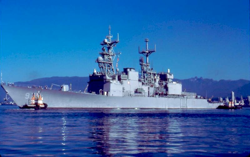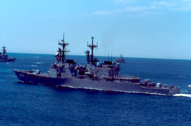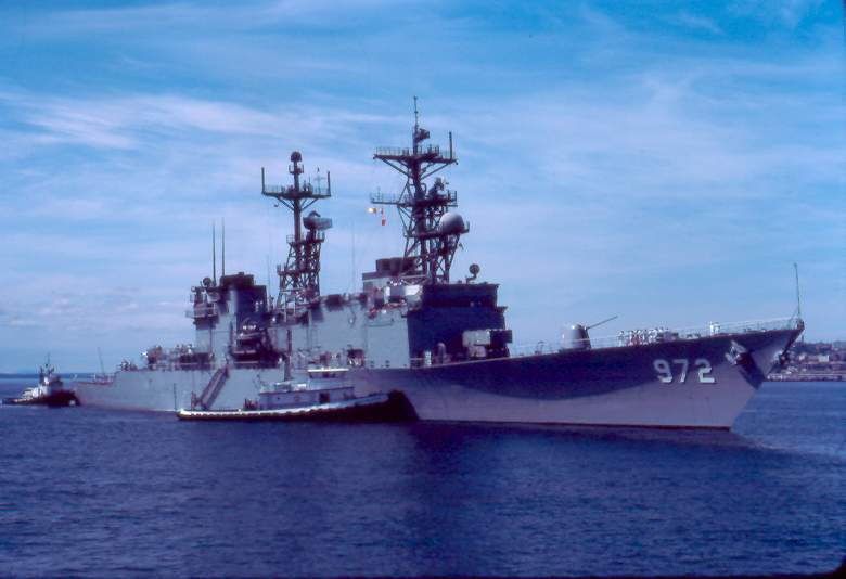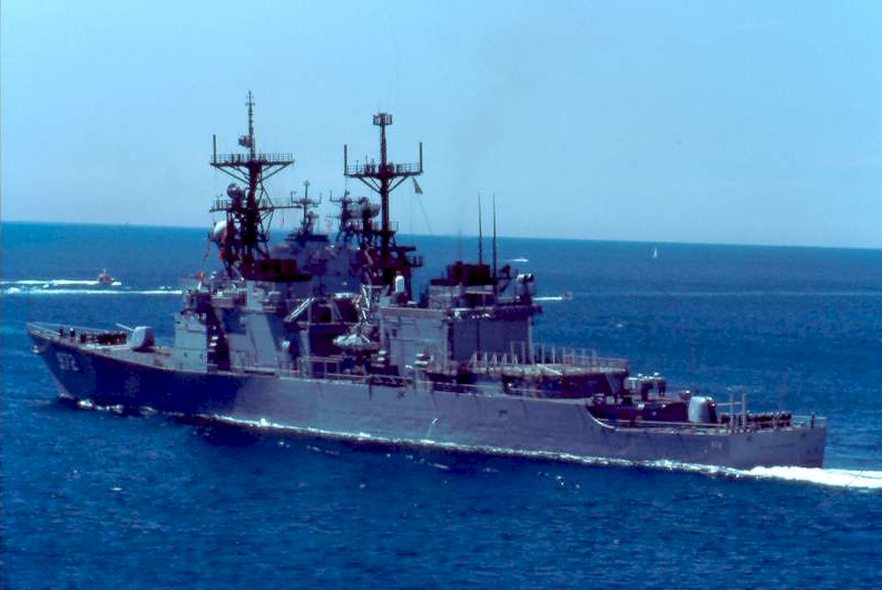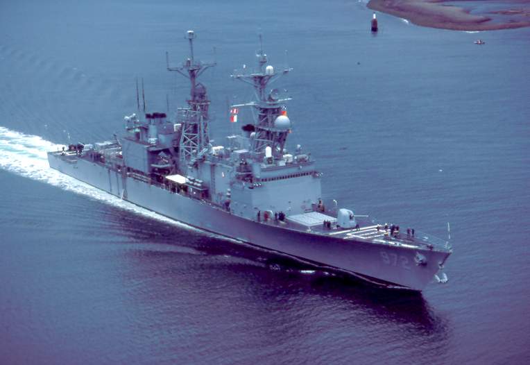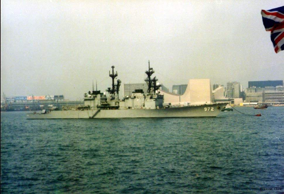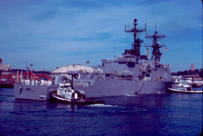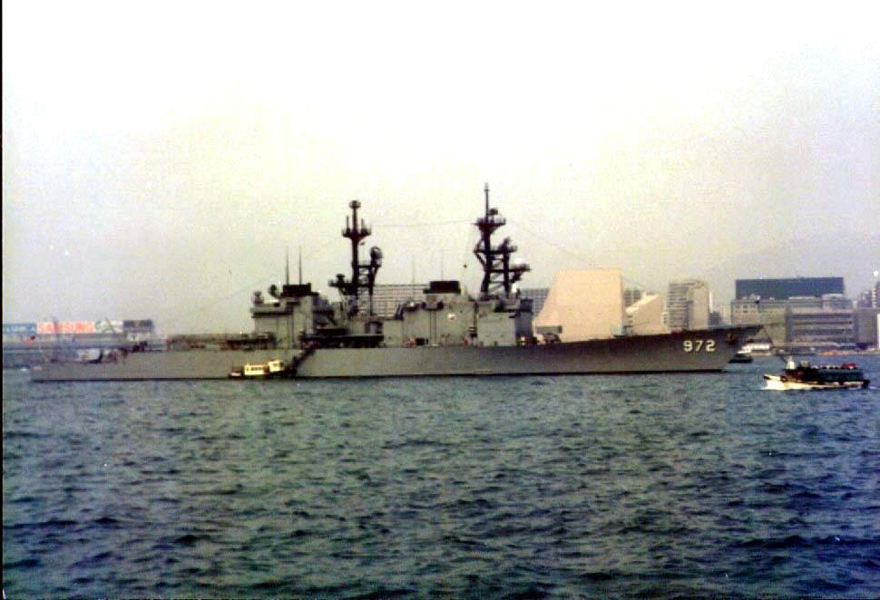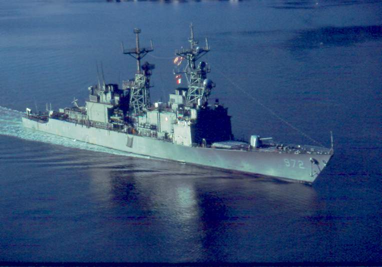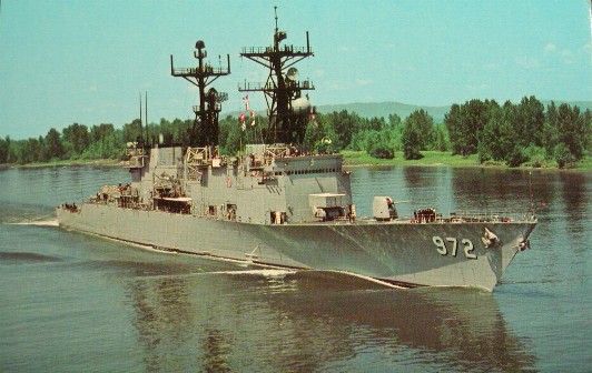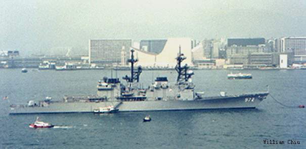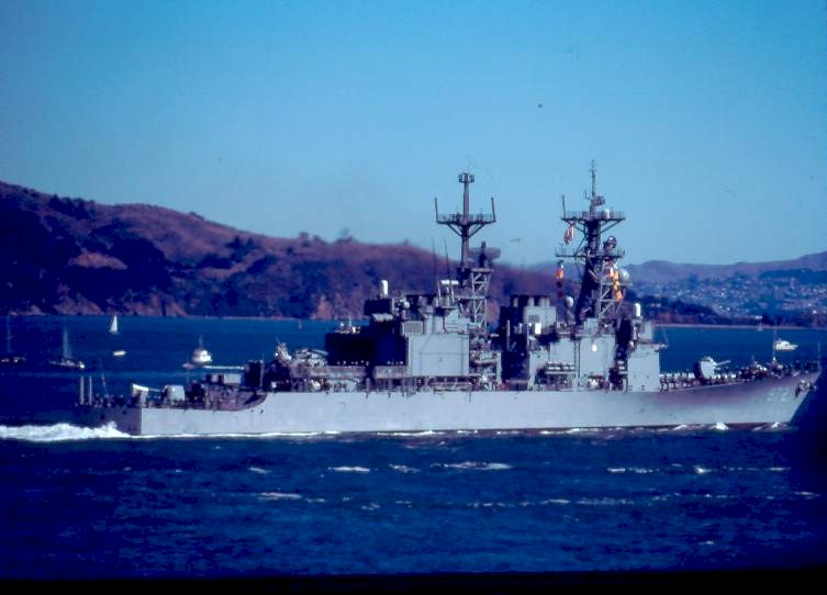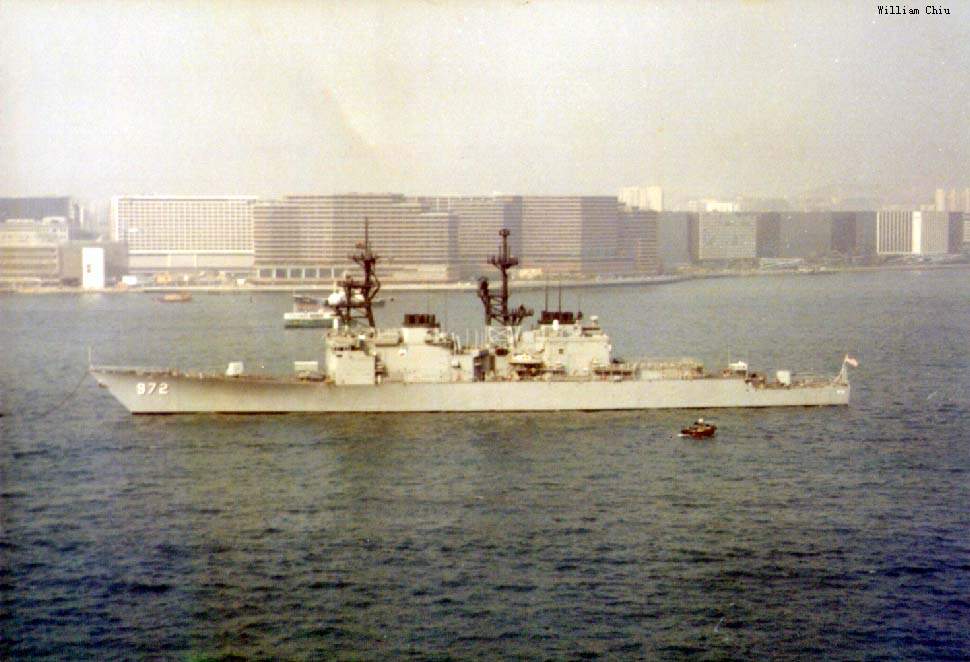 | 72k | DN-ST-87-02188. A port quarter view of the destroyer USS OLDENDORF (DD 972) entering the harbor. Accompanying the ship are the guided missile cruiser USS REEVES (CG 24) and the guided missile frigate USS RENTZ (FFG 46). This is the first visit by US Navy (USN) ships to China in 40 years. Photo by PH1 Charles Mussi, November 5 1986. | Bill Gonyo |
