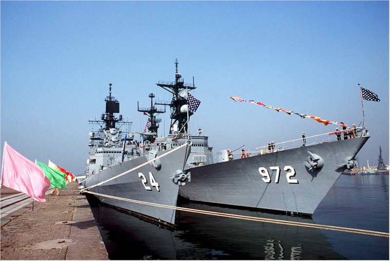 | 113k | DN-ST-87-03545. The guided missile cruiser USS REEVES (CG-24) and the destroyer USS OLDENDORF (DD-972) moored to a pier in Qingdao during the first visit by U.S. Navy ships to China in 40 years. Photo by PHC Chet King, November 1 1986. | Bill Gonyo |