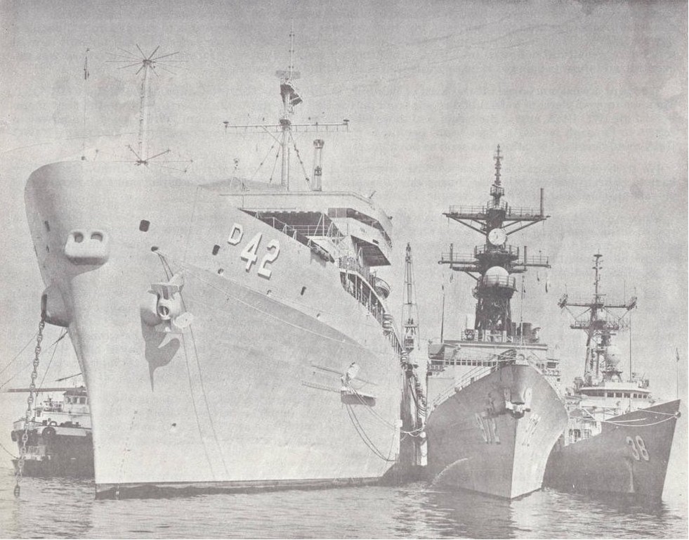 | 178k | The destroyer tender USS Acadia (AD-42) with the destroyer USS Oldendorf (DD-972) and the guided missile frigate USS Curts (FFG-38) alongside, and a sea-going tug on the other. This is a stock image file from the USS Acadia newspaper "Tendergram" November 1990. | Robert Hurst |
