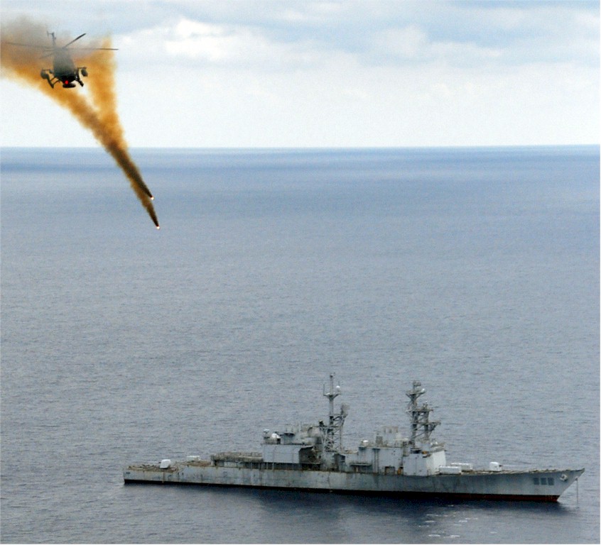 | 130k | 090429-N-8607B-288. Atlantic Ocean, April 29 2009, a Mexican BO-105 Bolkow helicopter fires 2.75" high-explosive rockets at the ex-USS Conolly (DD 979) during the sinking exercise portion of UNITAS Gold. This year marks the 50th iteration of UNITAS, a multinational exercise that provides opportunities for participating nations to increase their collective ability counter illicit maritime activities that threaten regional stability. Participating countries are Brazil, Canada, Chile, Colombia, Ecuador, Germany, Mexico, Peru, U.S. and Uruguay. U.S. Navy Photo by LT Chris Brown. | Lee Wahler/Mike Hibbard |