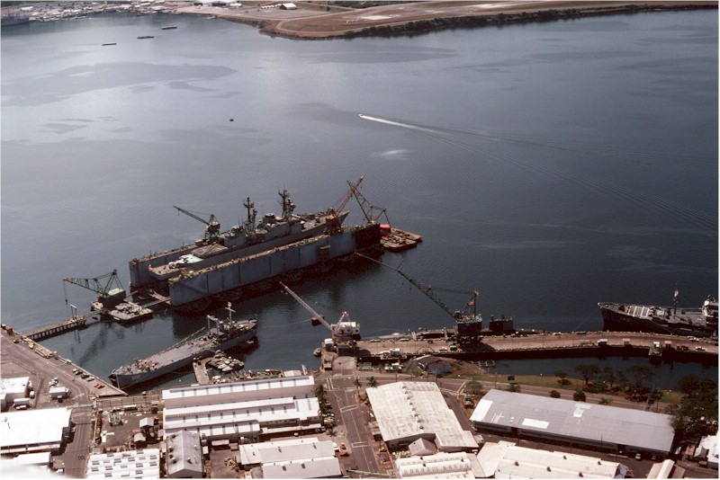 | 115k | DN-St-84-01212. February 14 1983, an aerial view of the ship repair facility at the U.S. Naval Station Subic Bay. The Spruance-class destroyer USS Leftwich (DD 984) can be seen in a floating dry dock. U.S. Navy Photo by PH2 R. Manary. | Robert M. Cieri |