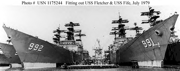 | 64k | Fitting out at Ingalls Shipbuilding, Pascagoula, Mississippi, on 20 July 1979. They were the final two of the original thirty Spruance class destroyers ordered by the U.S. Navy, and were to be formally christened on the following day, 21 July. Official U.S. Navy Photograph. | Fred Weiss |