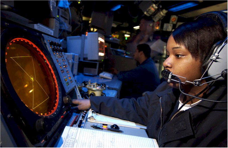 | 111k | 020706-N-6067M-001. Southeastern Pacific Ocean, July 5 2002, Operations Specialist Seaman Ja'Ida Davis mans a radar console aboard the guided-missile destroyer USS Fife (DD 991) during the Pacific Phase of UNITAS. UNITAS (Latin for Unity) is an exercise which involves warships from six countries participating in ten days of intense wargames designed to build multinational coalitions while promoting hemispheric defense and mutual cooperation. U.S. Navy photo by Photographer’s Mate 1st Class Shane T. McCoy. | Bill Gonyo |