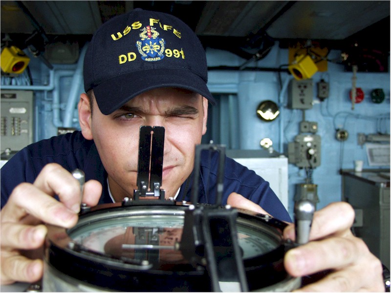 | 112k | 020621-N-1056B-001. At sea aboard USS Fife (DD 991), June 21 2002, Ensign Jesse Alvarez marks the position of a Colombian frigate from USS Fife while the two ships are off the Eastern Coast of South America participating in the 43rd annual UNITAS exercise. UNITAS is the largest multinational naval exercise conducted with naval forces from the U.S., the Caribbean Sea, and South and Central America. The exercise focuses on building multinational coalitions while promoting hemispheric defense and mutual cooperation. U.S. Navy photo by Lieutenant Corey Barker. | Bill Gonyo |
