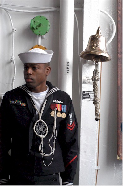 | 61k | 030228-N-6477M-191. Naval Station Everett, WA, February 28 2003, Boatswain’s Mate 2nd Class Derrick L. Paulding stands ready to sound bells for distinguished visitors arriving aboard USS Fife (DD 991) during the ship’s decommissioning ceremony. U.S. Navy photo by Photographer's Mate 2nd Class Eli Jody Medellin. | Bill Gonyo |
