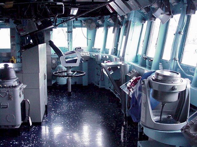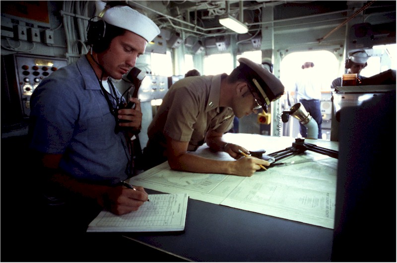 | 97k | DN-ST-85-00254. Quartermaster 3rd Class (QM3) Ray B. Ortega and Lieutenant J. W. Sweet, ship's navigator, man the chart table on the bridge of the destroyer USS FIFE (DD 991) during operations near Subic Bay, Republic of the Philippines. Photo by PH1 Dave MacLean, March 12 1982. | Bill Gonyo |