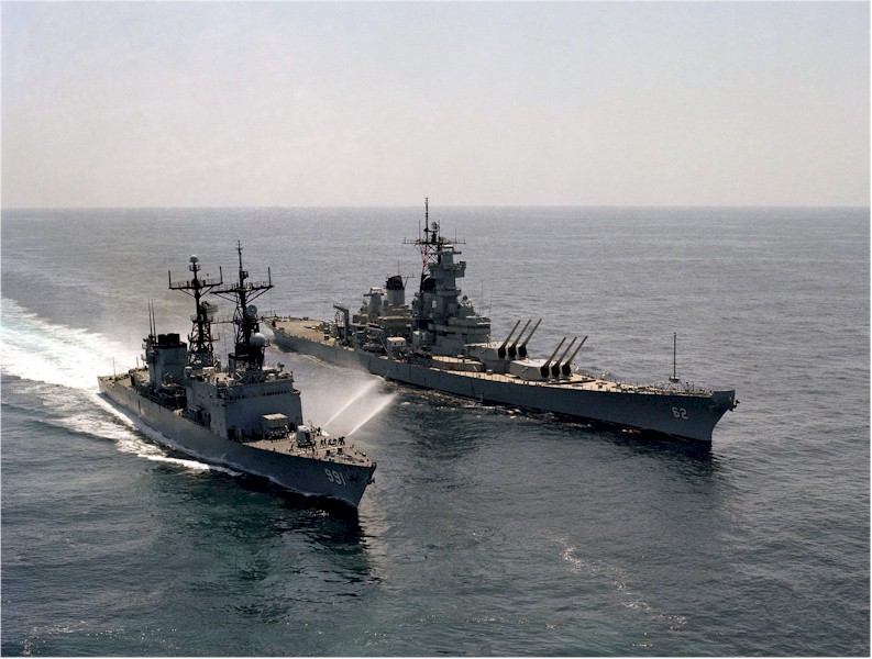 | 122k | DN-SC-84-04677. April 14 1983, an aerial starboard bow view of the destroyer USS Fife (DD 991), left, and the battleship USS New Jersey (BB 62) underway. The crew of the Fife is involved in a wash down operation. U.S. Navy Photo by PH2 D. Smith. | Robert M. Cieri |