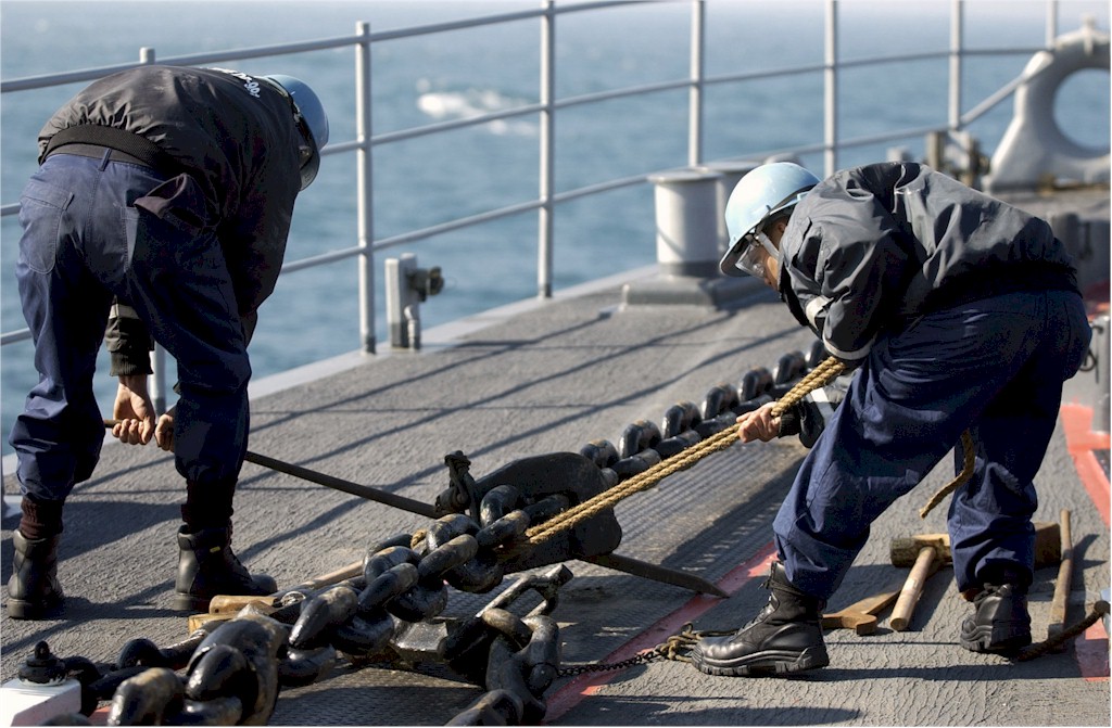 | 193k | 020707-N-6967M-006. Southern Pacific Ocean, July 7 2002, Seaman Matthew Johnston (left) and Boatswain's Mate Petty Officer 3rd Class Lody Quinola (right) free the “pelican hook” anchor chain locking mechanism aboard the guided-missile destroyer USS Fife (DD 991) during exercise UNITAS 2002. UNITAS (Latin for “unity”) is an exercise which involves warships from six countries participating in ten days of intense wargames designed to build multinational coalitions while promoting hemispheric defense and mutual cooperation. U.S. Navy photo by Photographer’s Mate 1st Class Shane T. McCoy. | Robert M. Cieri |
