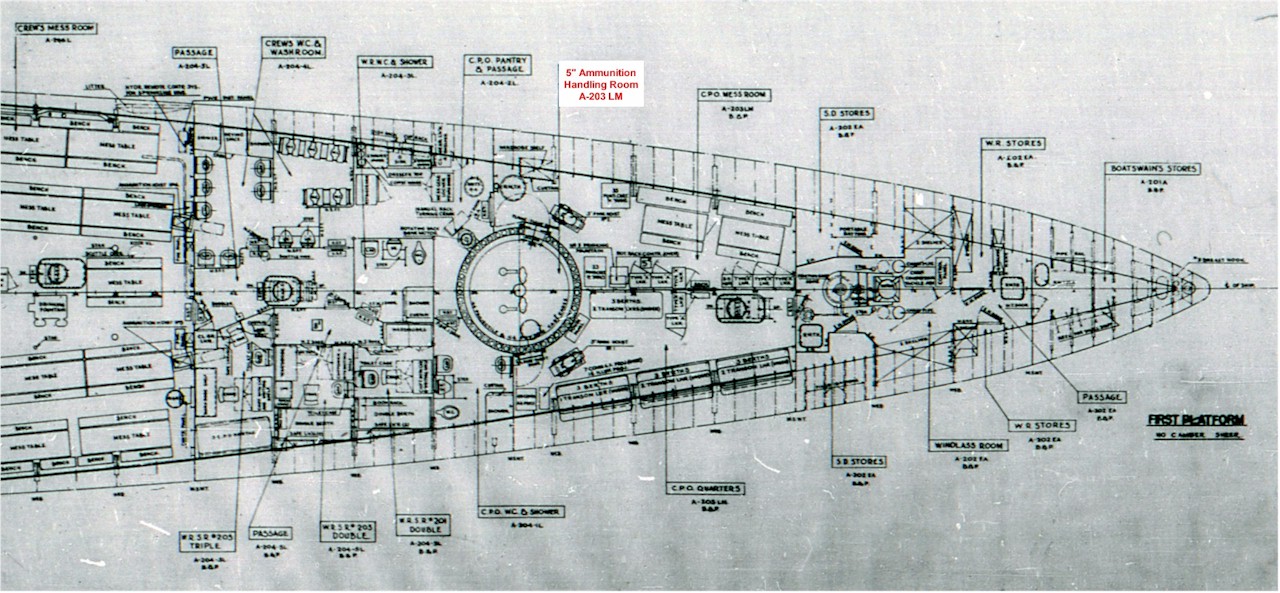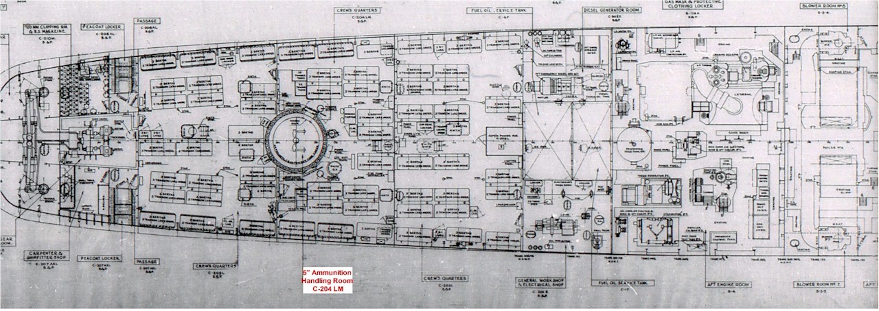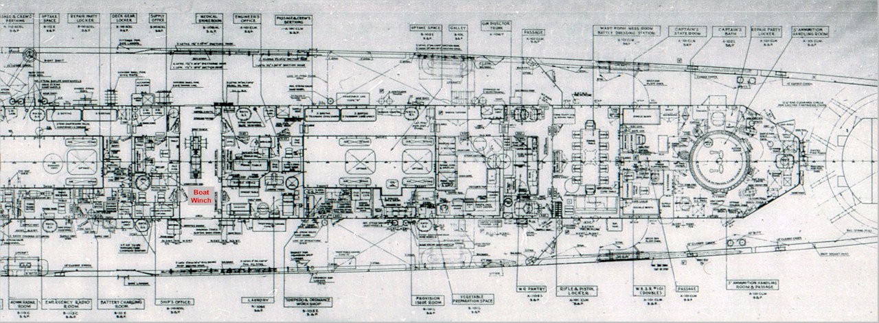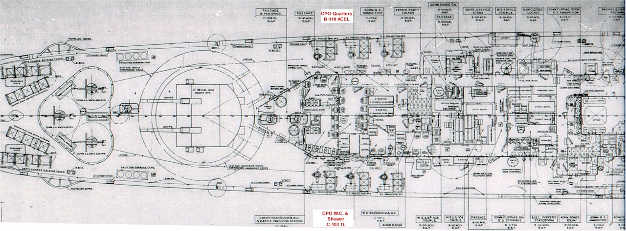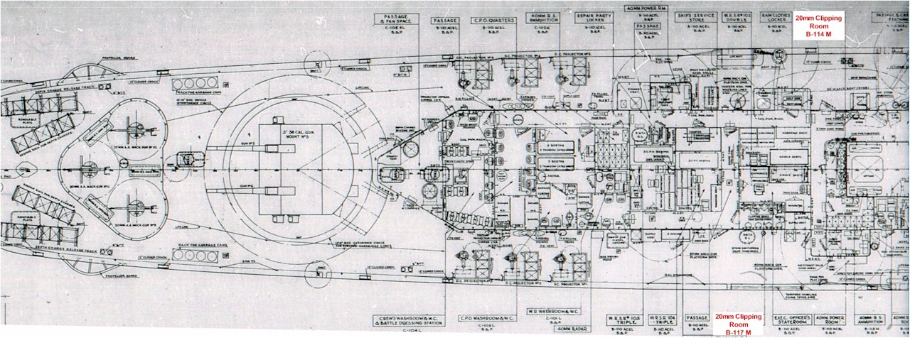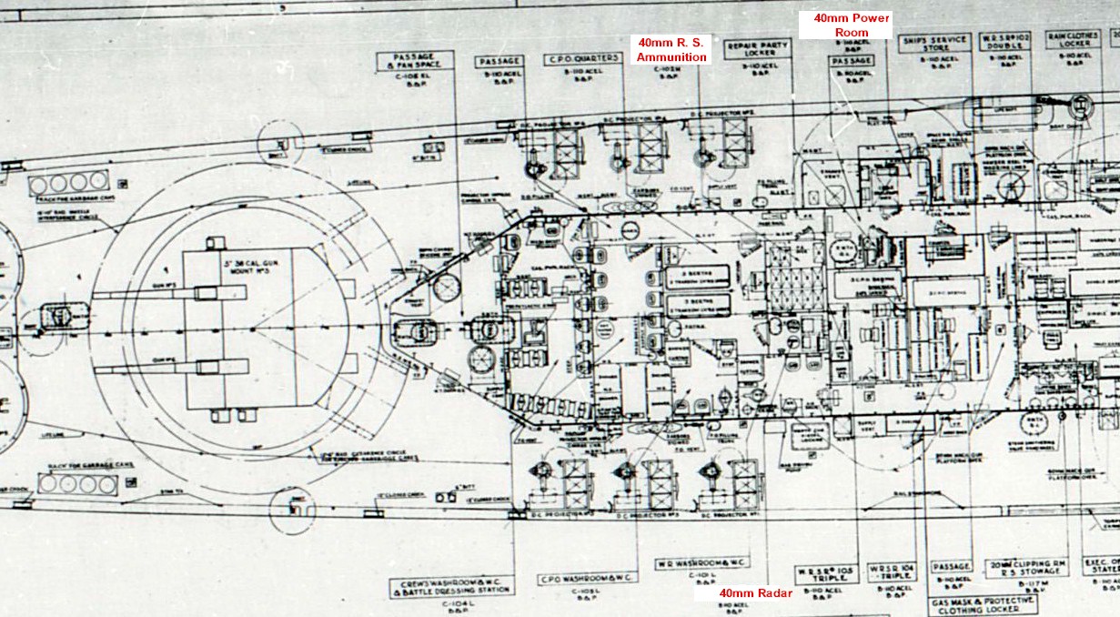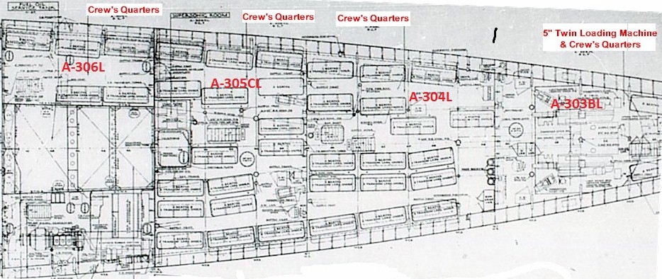 berthing compartment below. Located at the stern or fantail of the ship, just forward of gun mount #53. That means the 3rd 5" gun