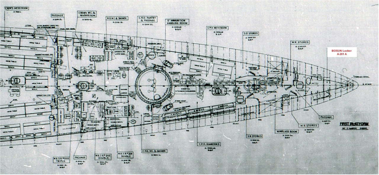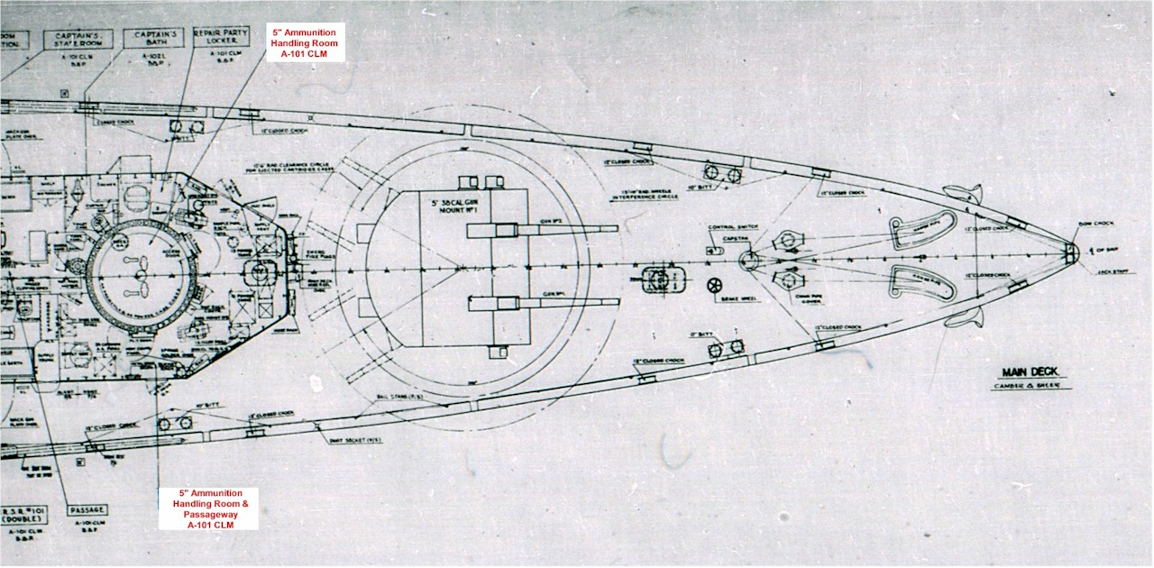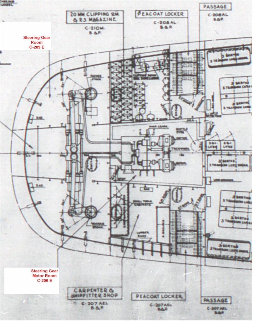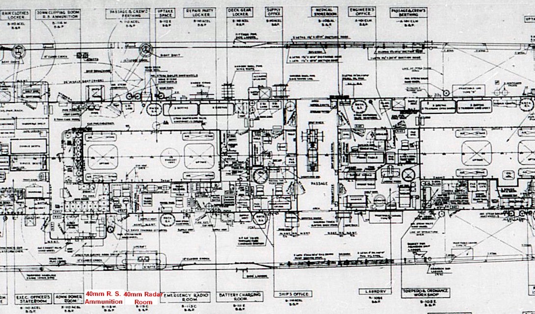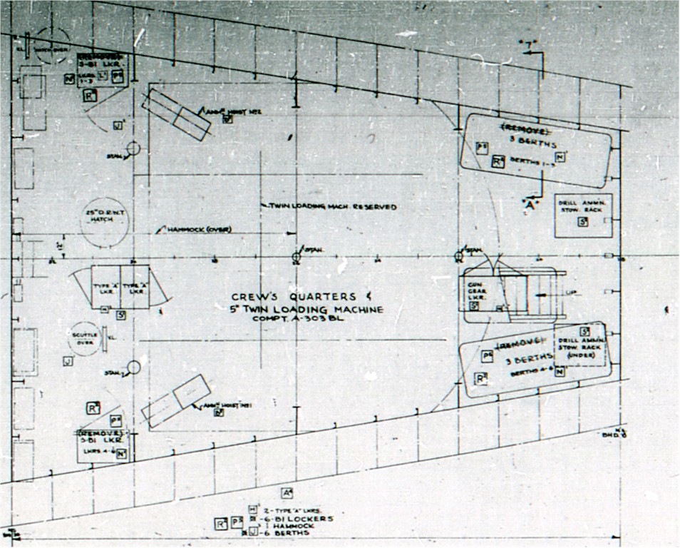 berthing compartment below. Located at the stern or fantail of the ship, just forward of gun mount #53. That means the 3rd 5" gun