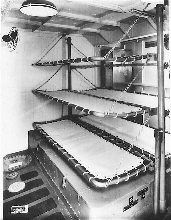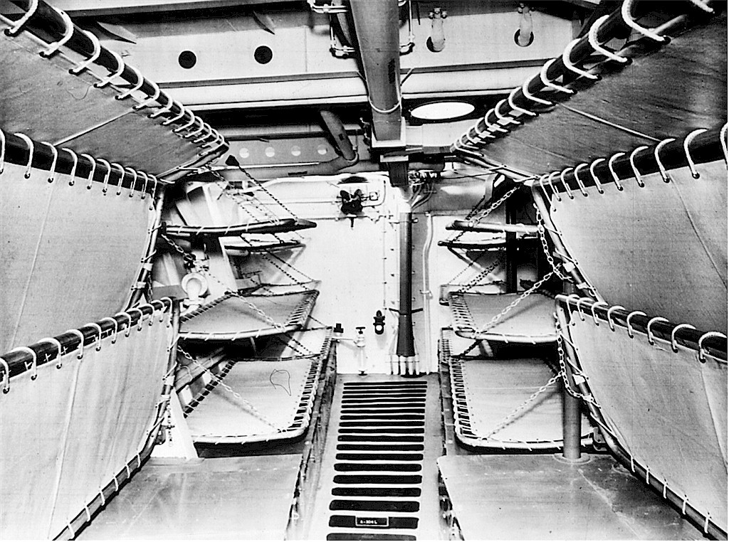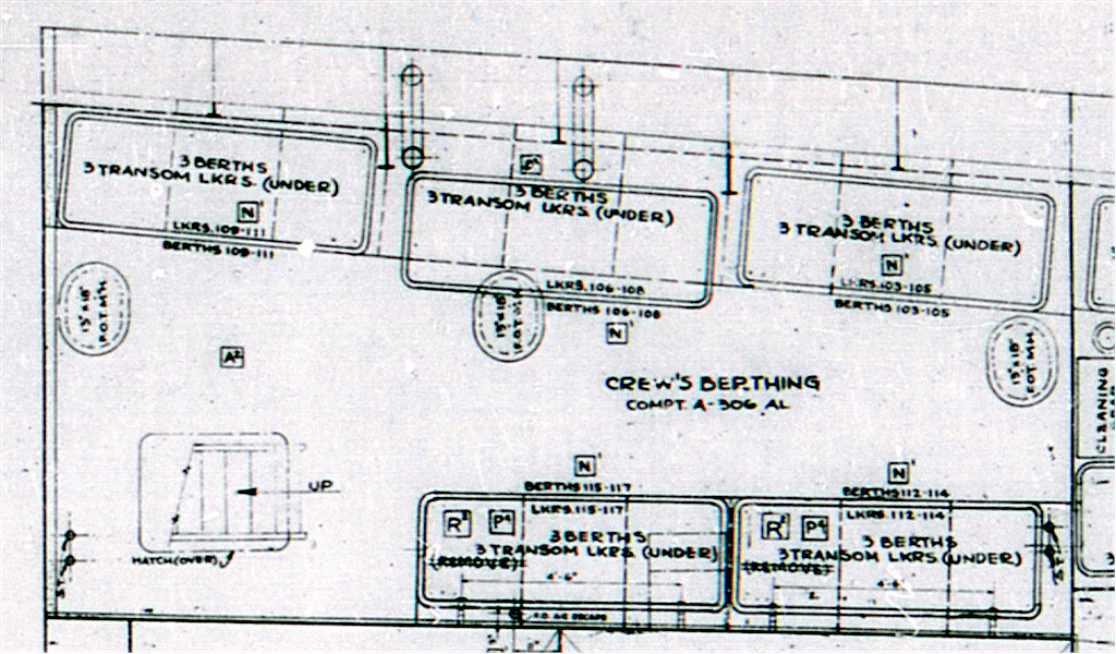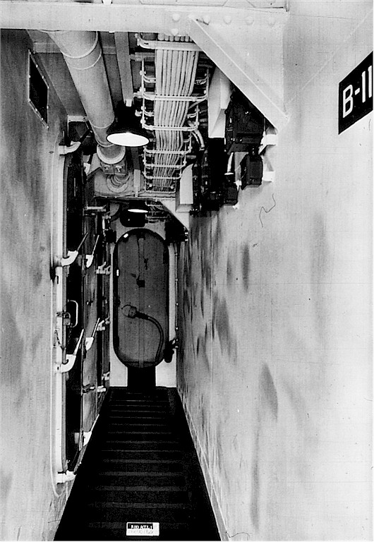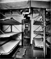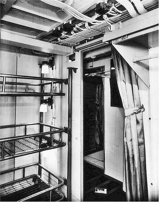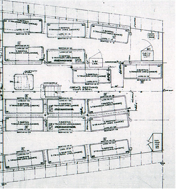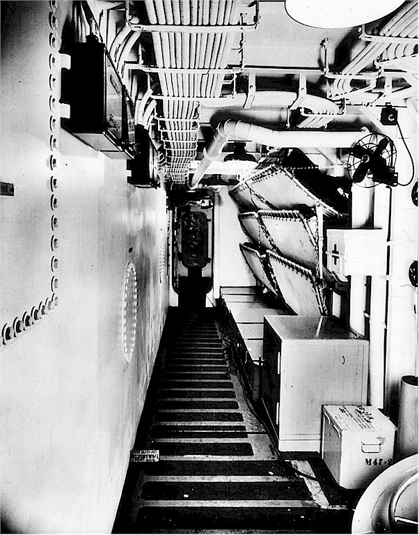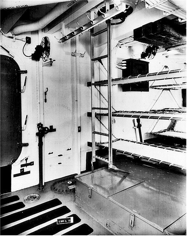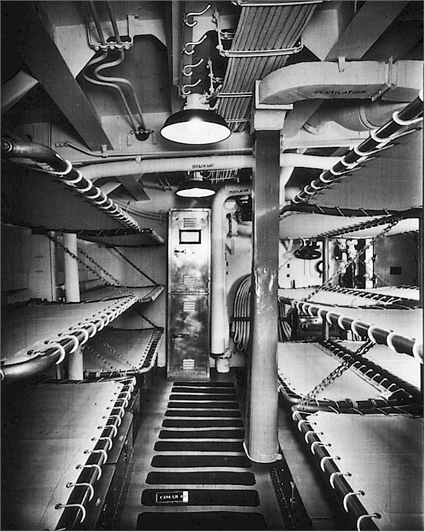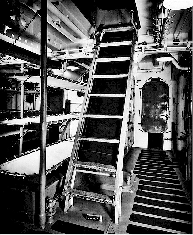 Hatch to B-3 (aft fire room) visible on deck beyond bunks. |