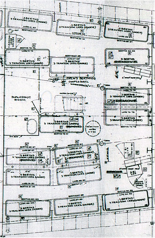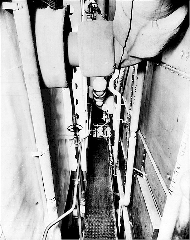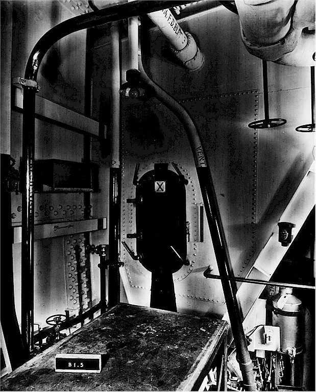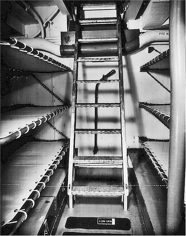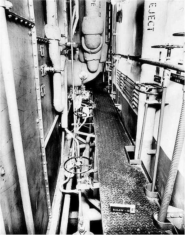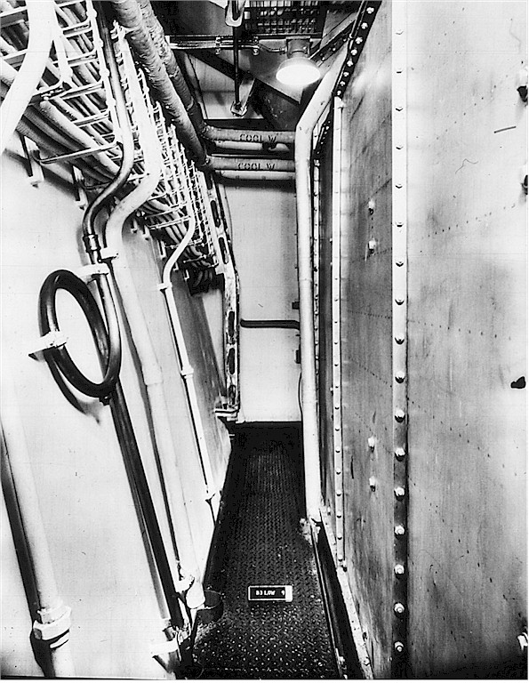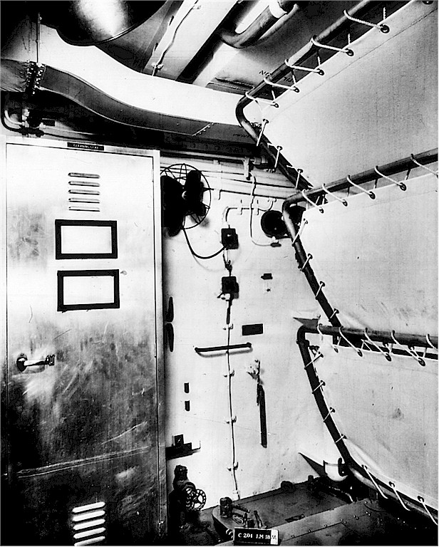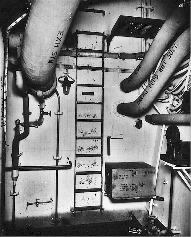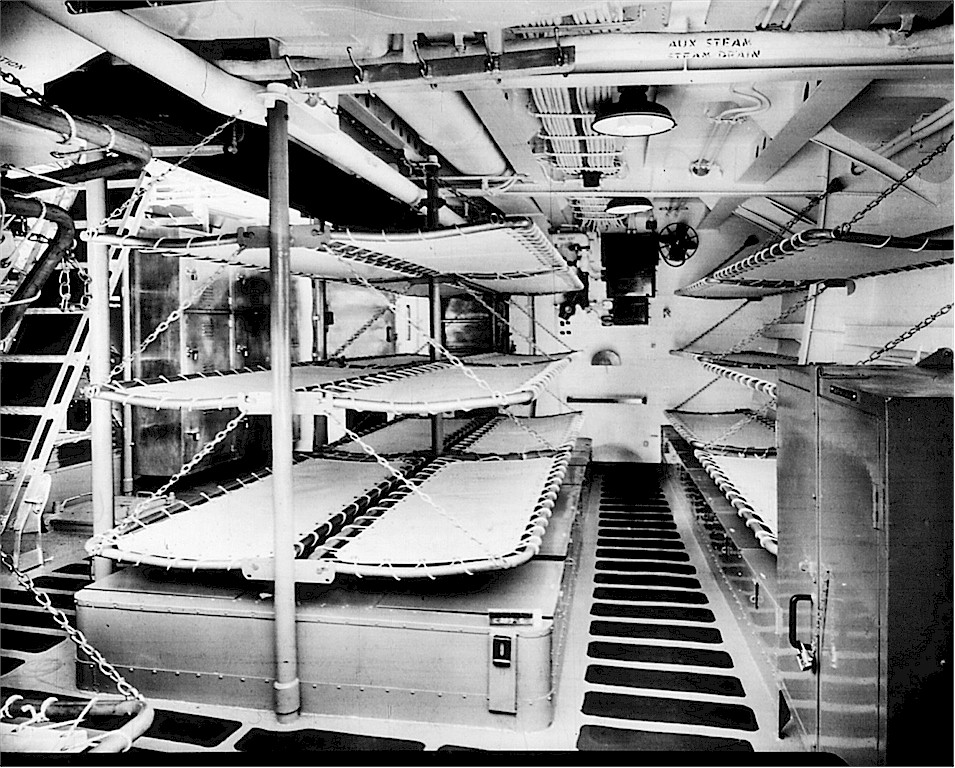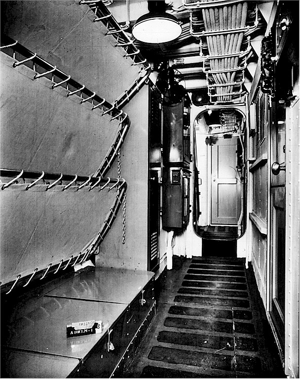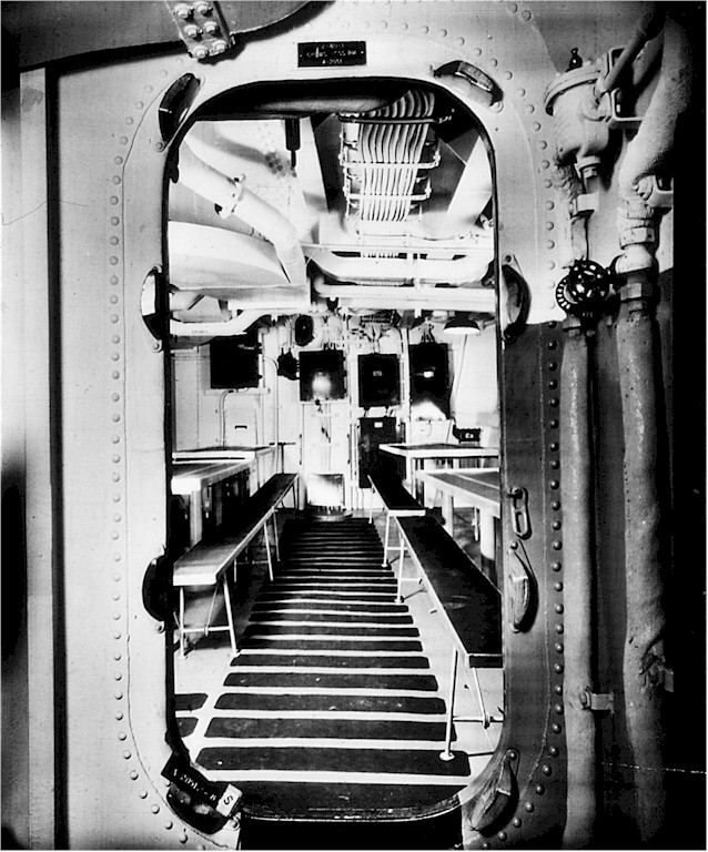 Hatch to B-3 (aft fire room) visible on deck beyond bunks. |