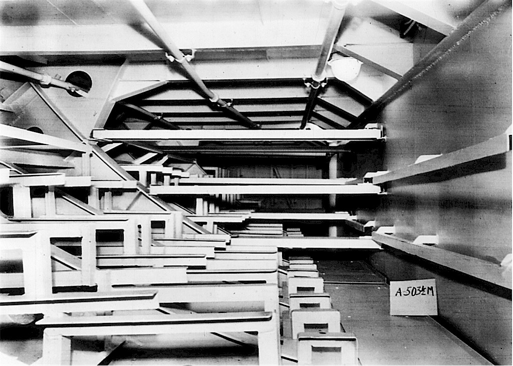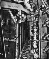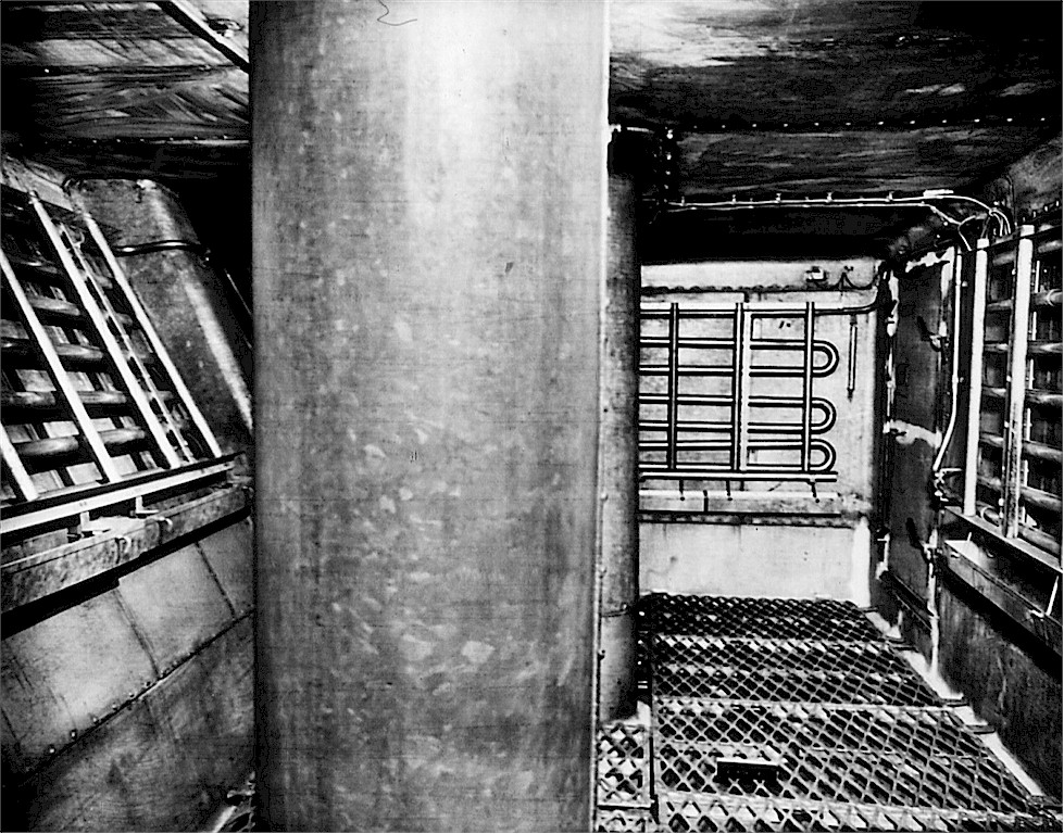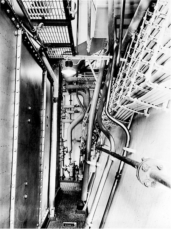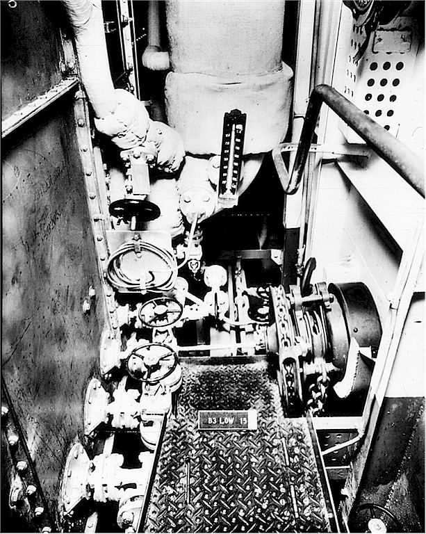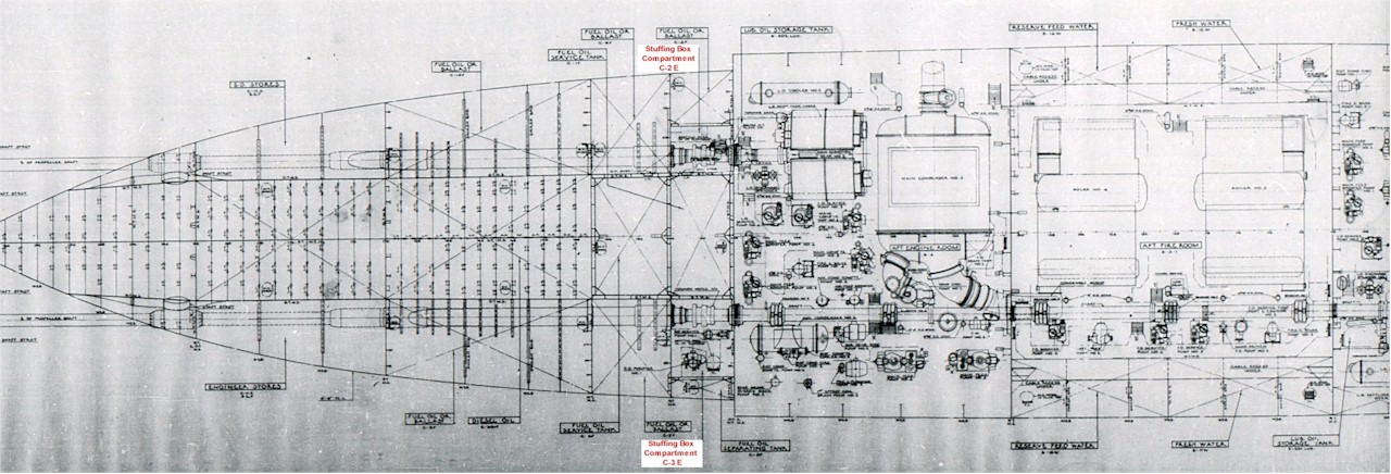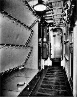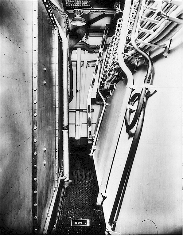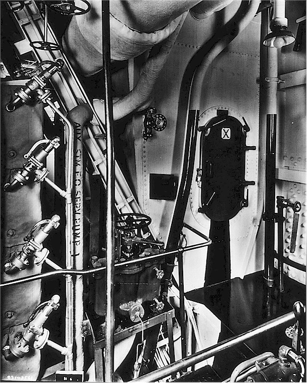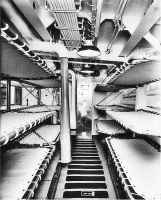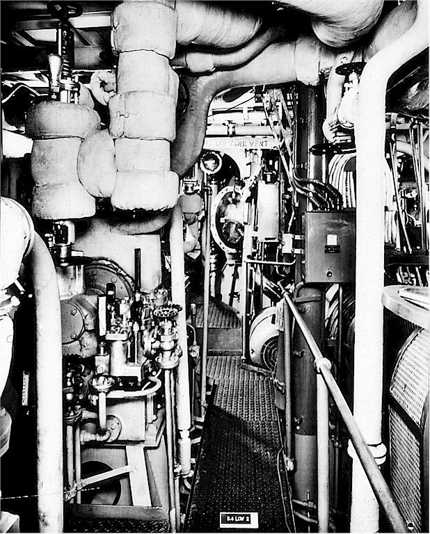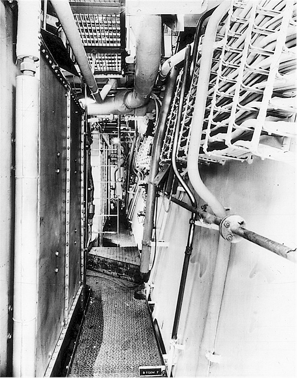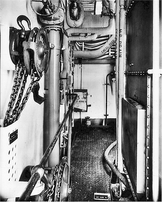 Hatch to B-3 (aft fire room) visible on deck beyond bunks. |
